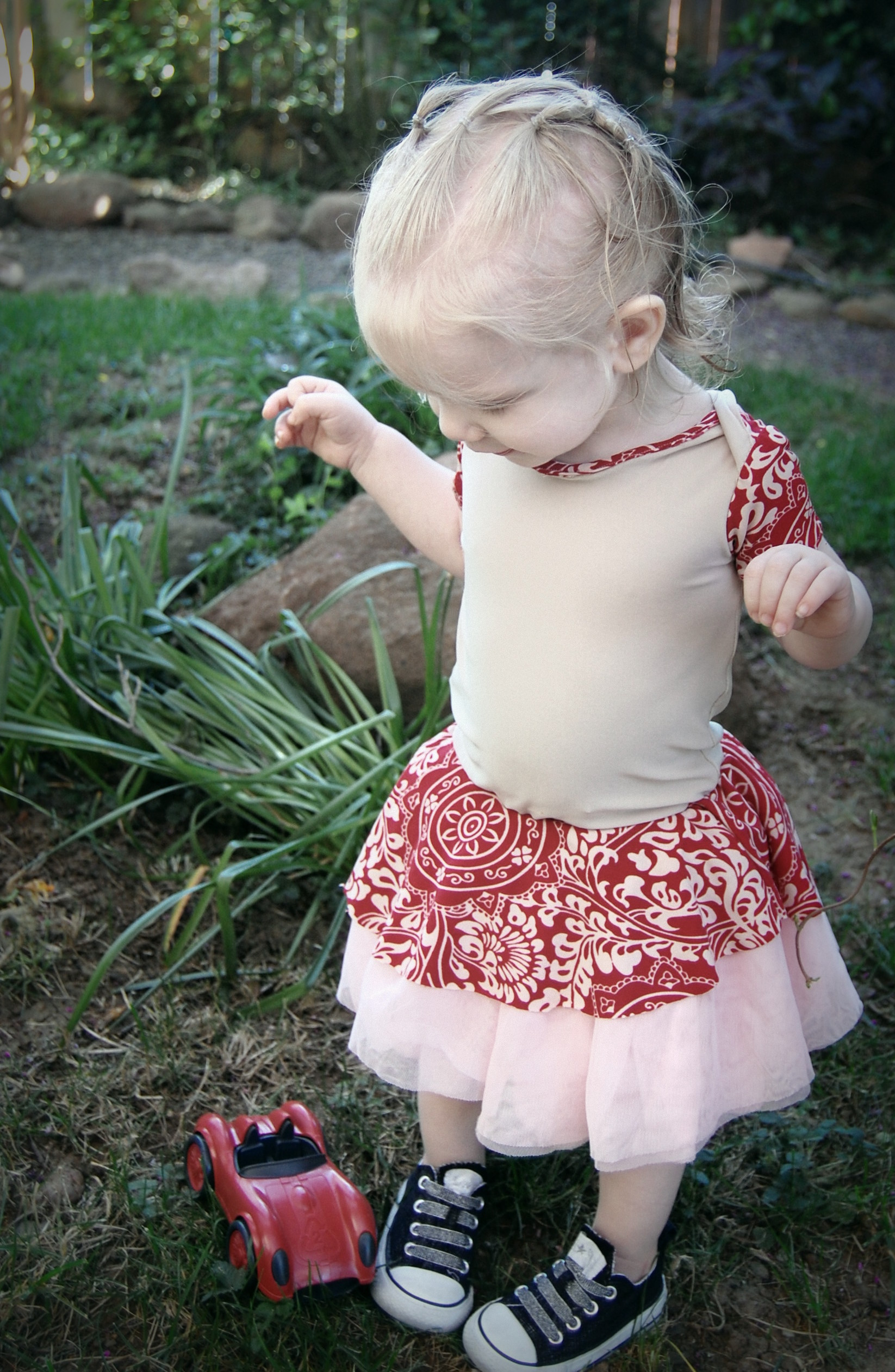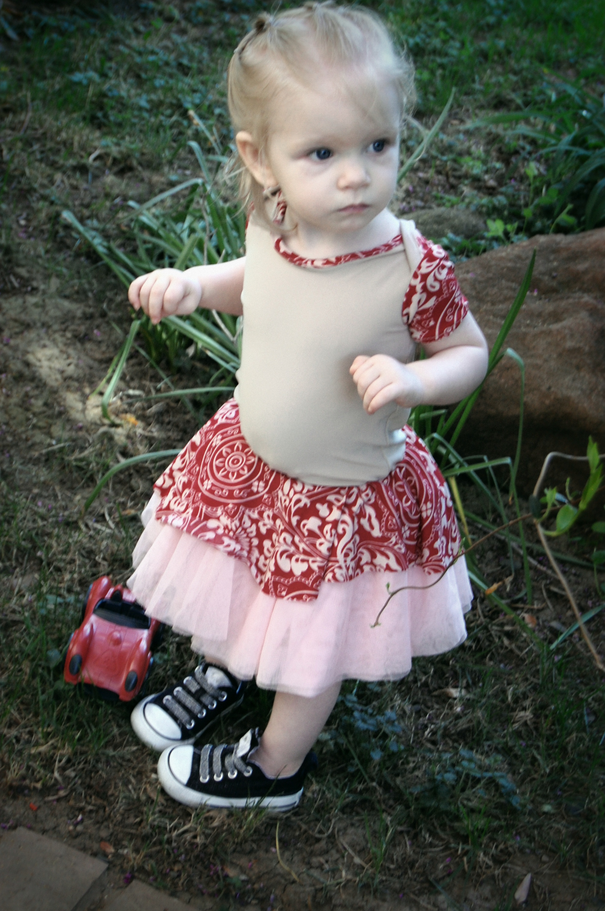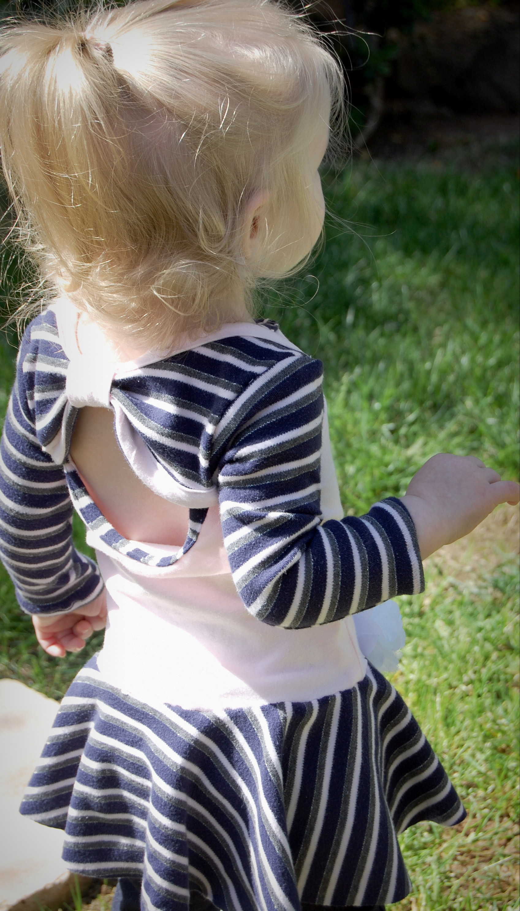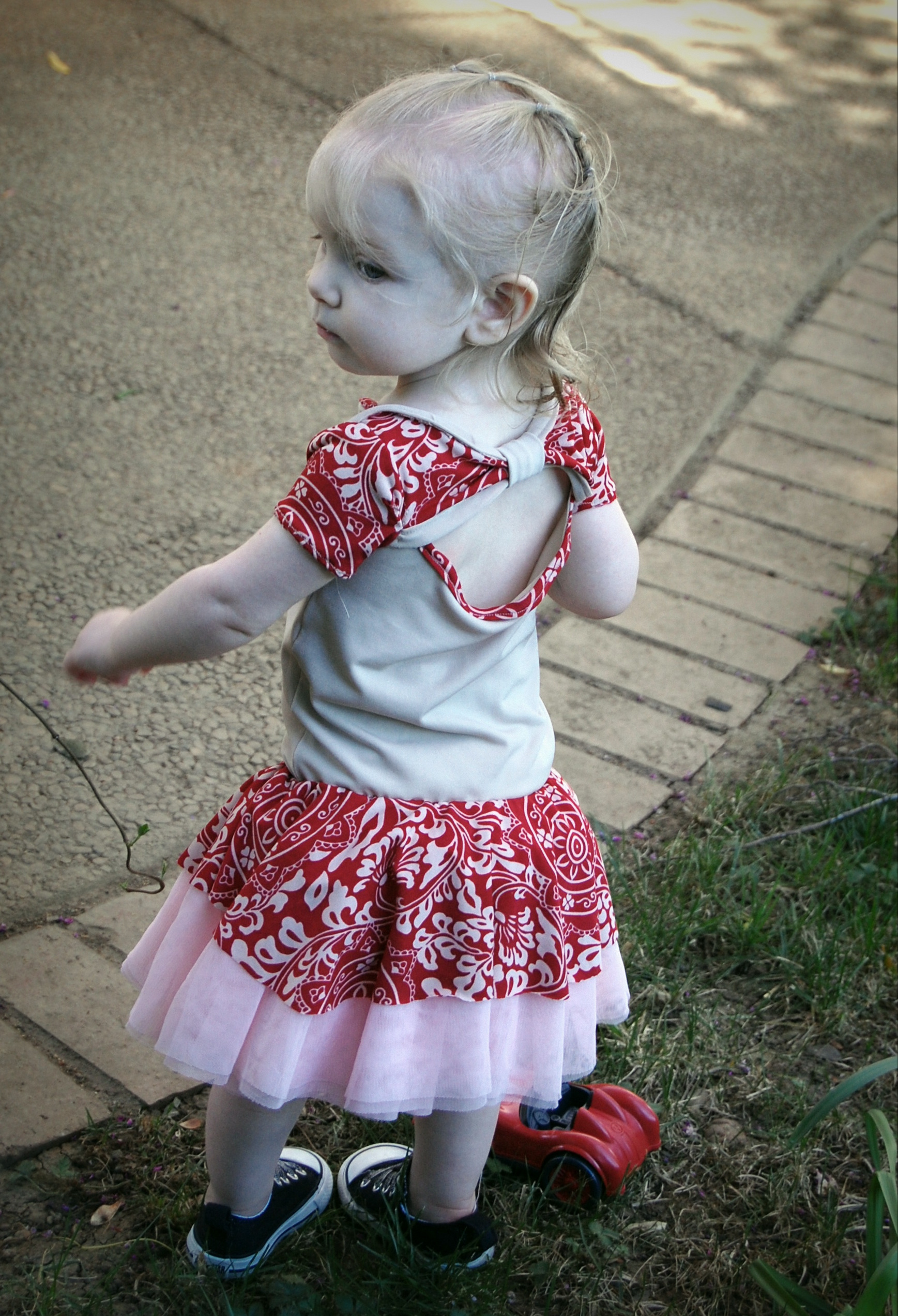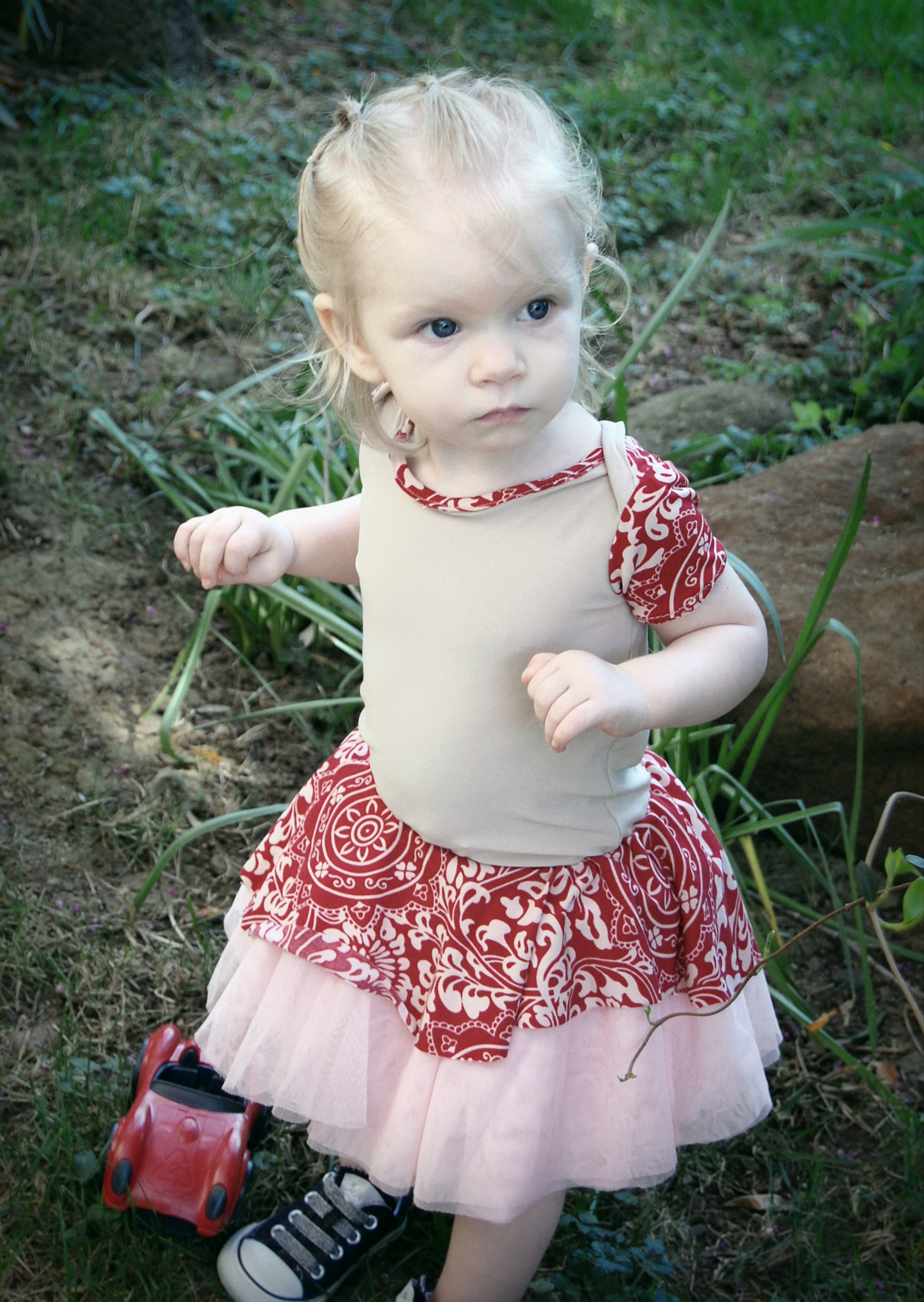 This bodysuit was much more of a challenge. The fabrics I used were really slinky and slippery. Originally, I thought I’d leave the peplum off on this one. I cut it anyway “just in case.” Because I was upcycling shirts, I accidentally cut the circle across a seam – even though I’d checked it three times to be sure that wasn’t the case. So…I did what anyone would do when I decided that I did, indeed , want the peplum. I cut the seam off, following the curve of the other side. I also was going to do arm bands on a sleeveless version – but, I decided that it wanted short sleeves. In fact, it needed short sleeves, so that’s what I did. I placed the peplum on with the shorter part on one side, and the longer on the other, so it would create a waterfall effect. For the pictures, I styled it over a Joe Fresh tutu and with Converse baby sneakers. I LOVE both so much. I’m already thinking about doing a third – the full dress version with the high low skirt that comes in Little Kiwi’s Closet’s Bow Back Beauty pattern. The pattern is for sizes NB-14. Designer Lydia Persson really amazes me with her talent.