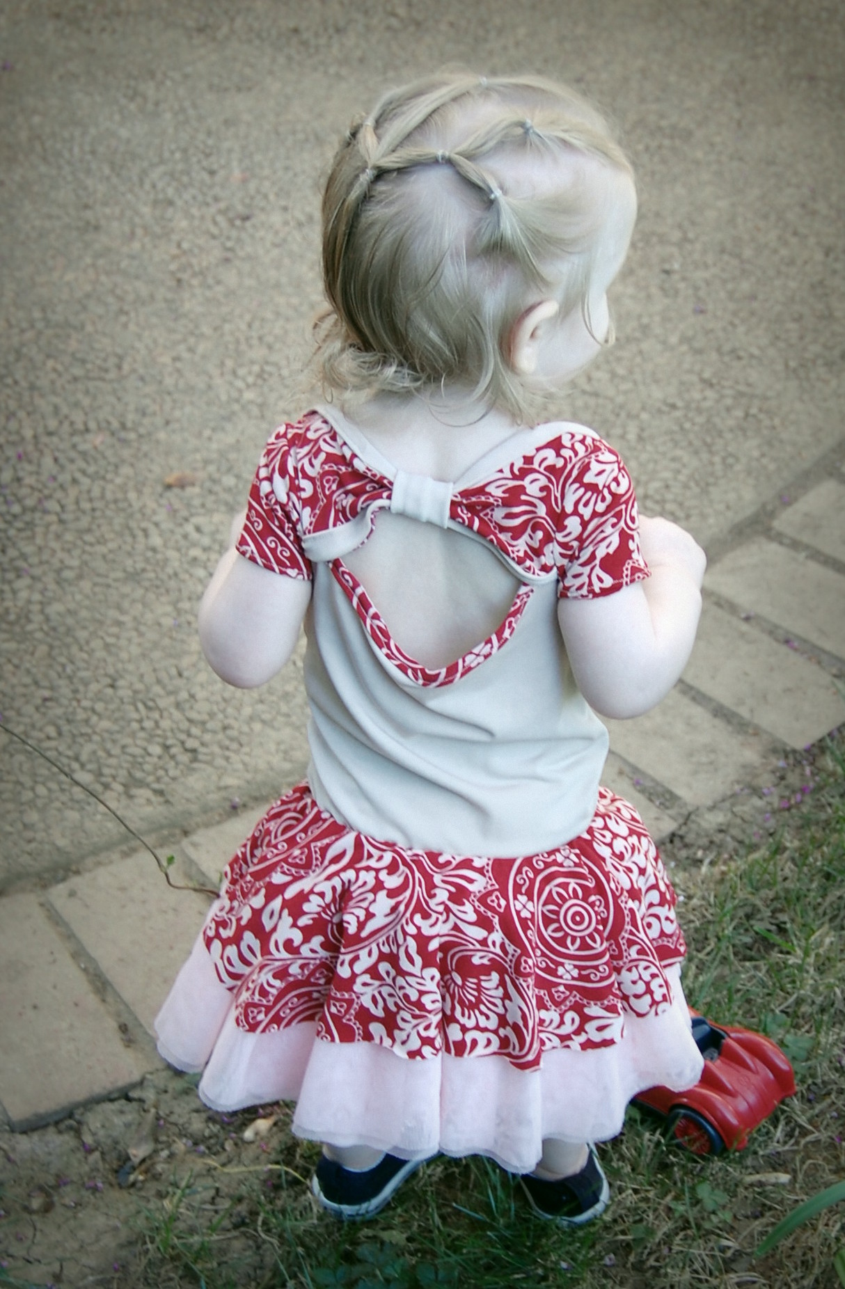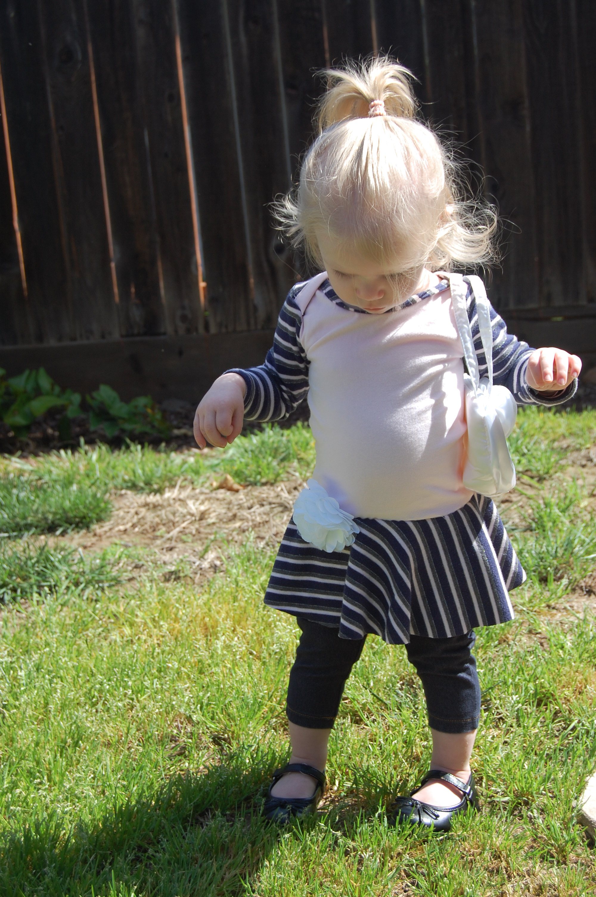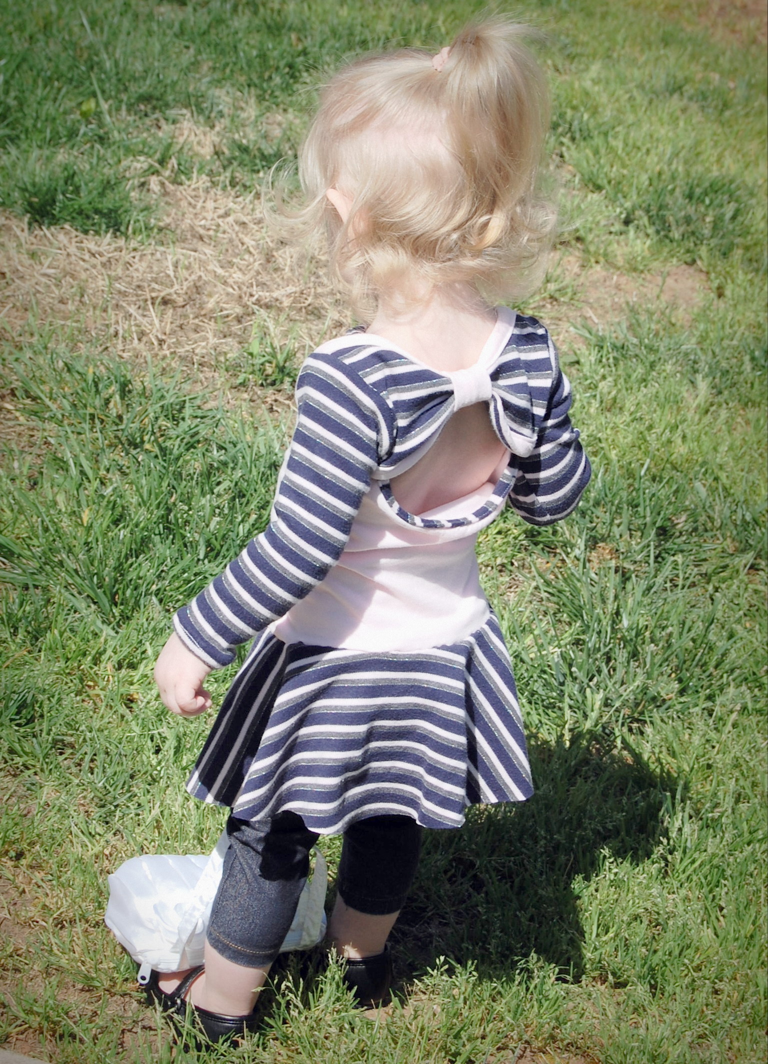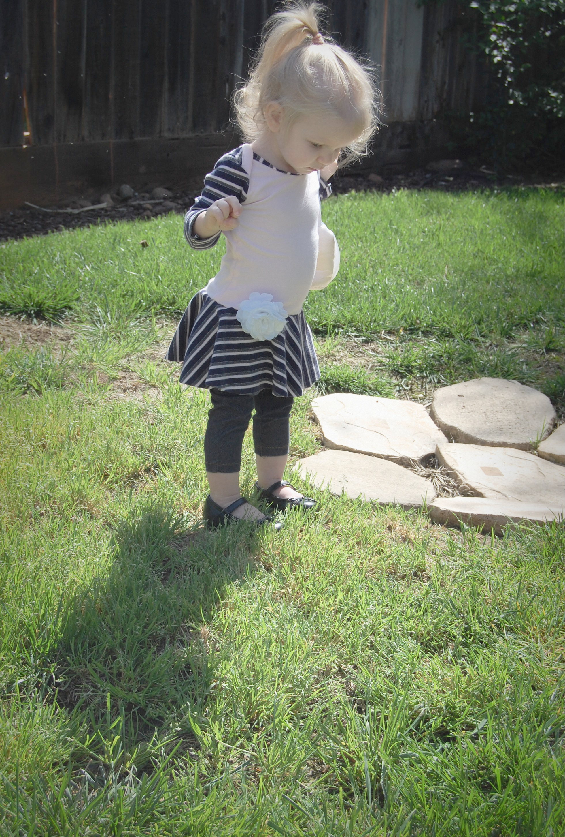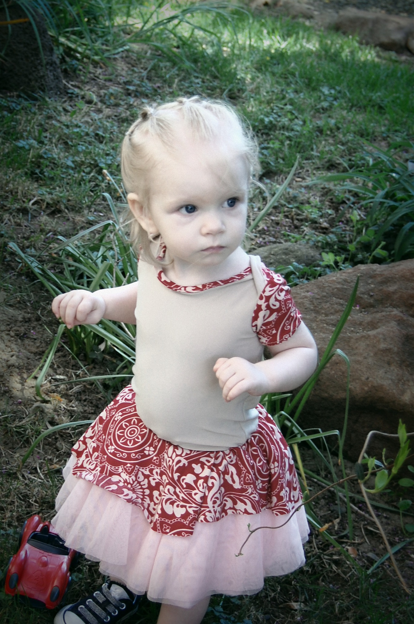 This bodysuit was much more of a challenge. The fabrics I used were really slinky and slippery. Originally, I thought I’d leave the peplum off on this one. I cut it anyway “just in case.” Because I was upcycling shirts, I accidentally cut the circle across a seam – even though I’d checked it three times to be sure that wasn’t the case. So…I did what anyone would do when I decided that I did, indeed , want the peplum. I cut the seam off, following the curve of the other side. I also was going to do arm bands on a sleeveless version – but, I decided that it wanted short sleeves. In fact, it needed short sleeves, so that’s what I did. I placed the peplum on with the shorter part on one side, and the longer on the other, so it would create a waterfall effect. For the pictures, I styled it over a Joe Fresh tutu and with Converse baby sneakers. I LOVE both so much. I’m already thinking about doing a third – the full dress version with the high low skirt that comes in Little Kiwi’s Closet’s Bow Back Beauty pattern. The pattern is for sizes NB-14. Designer Lydia Persson really amazes me with her talent.