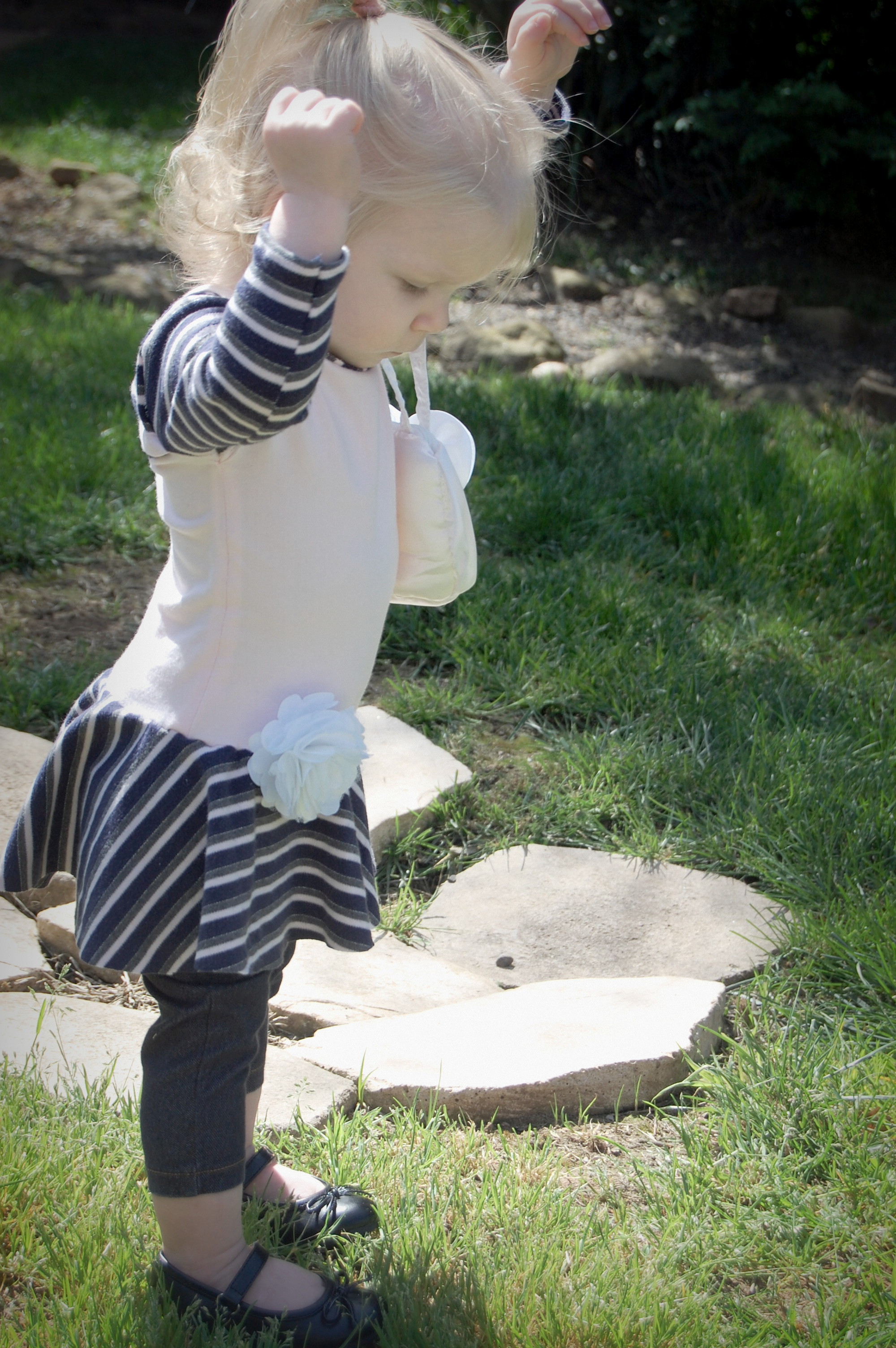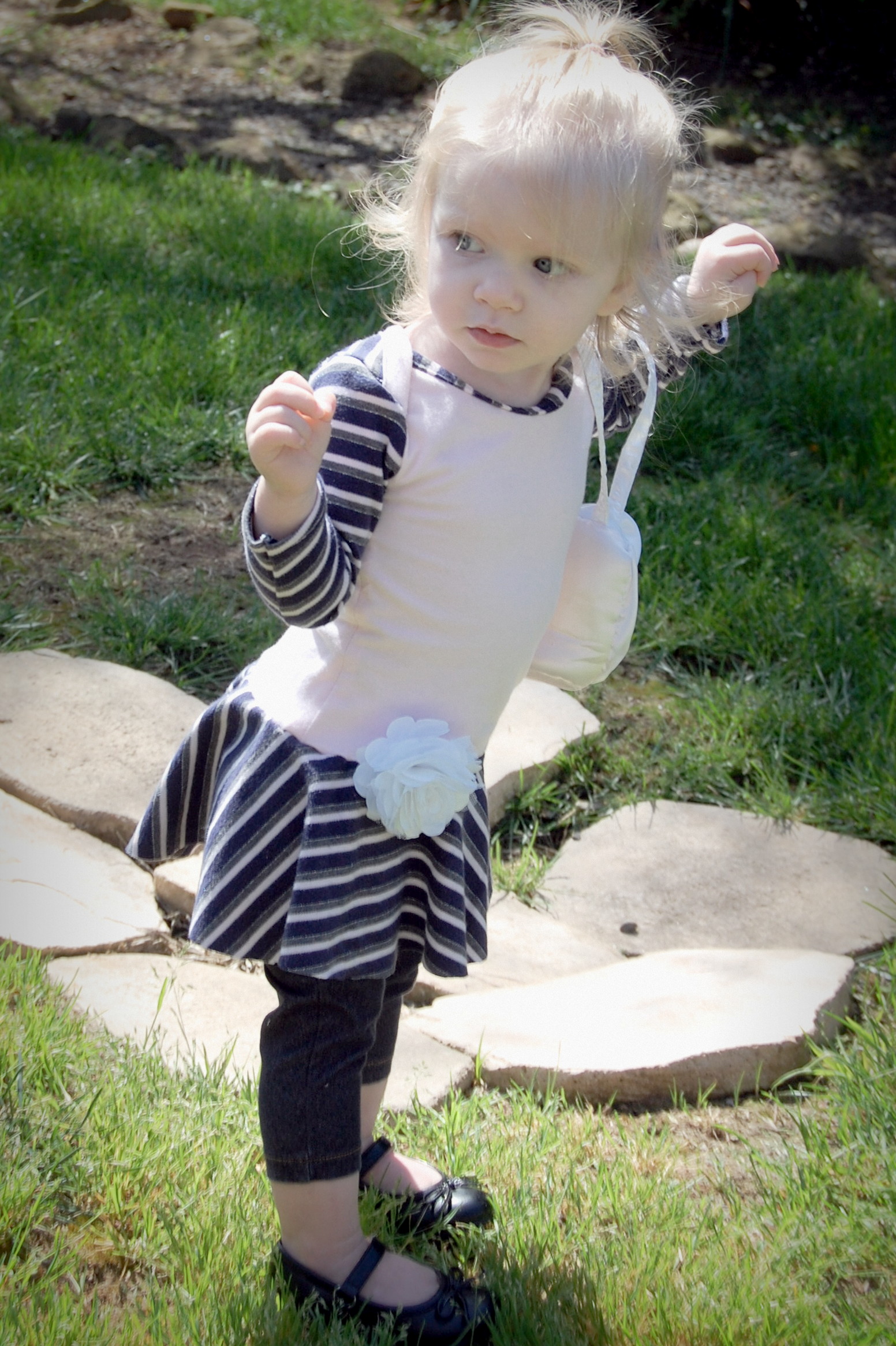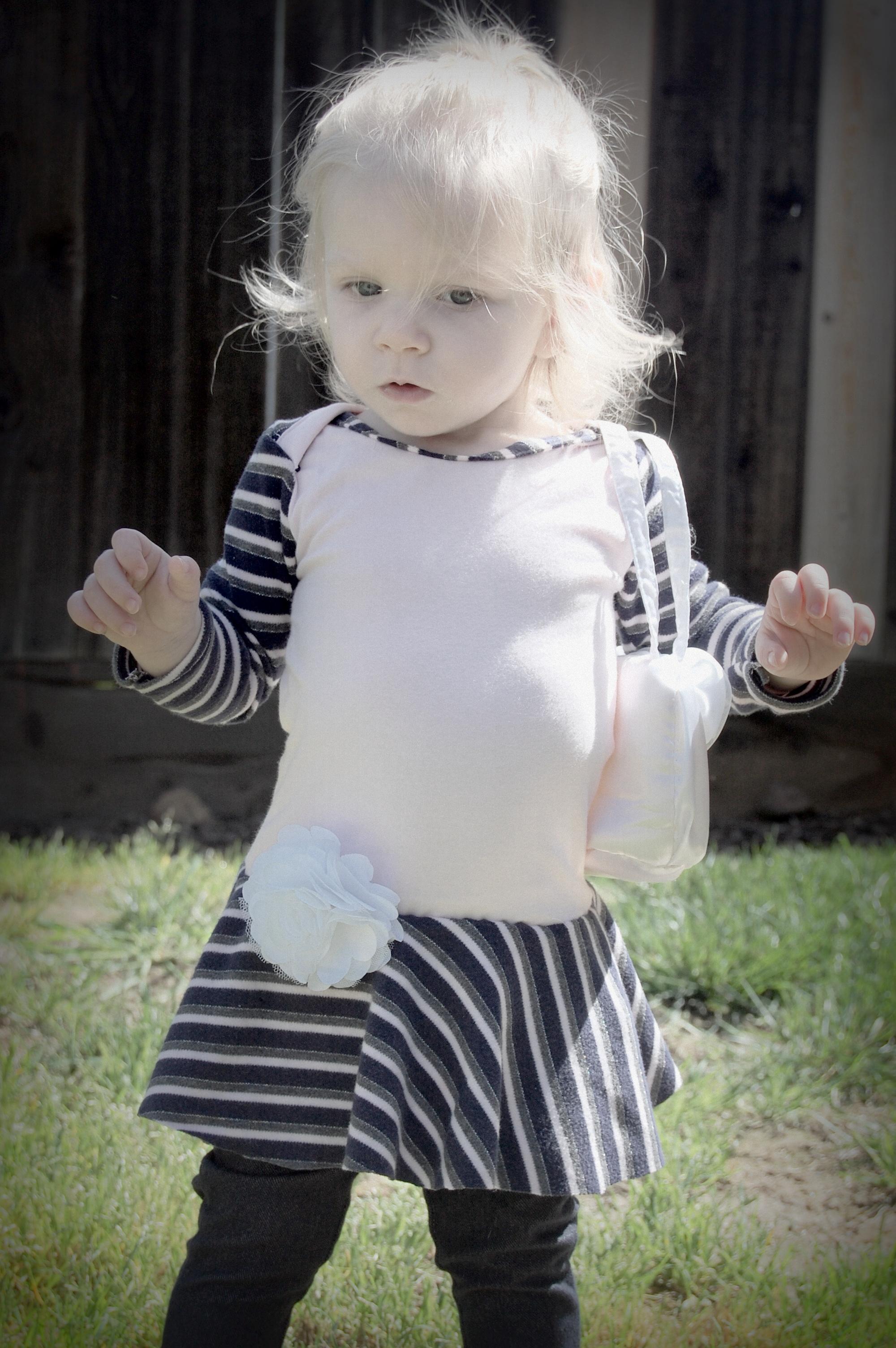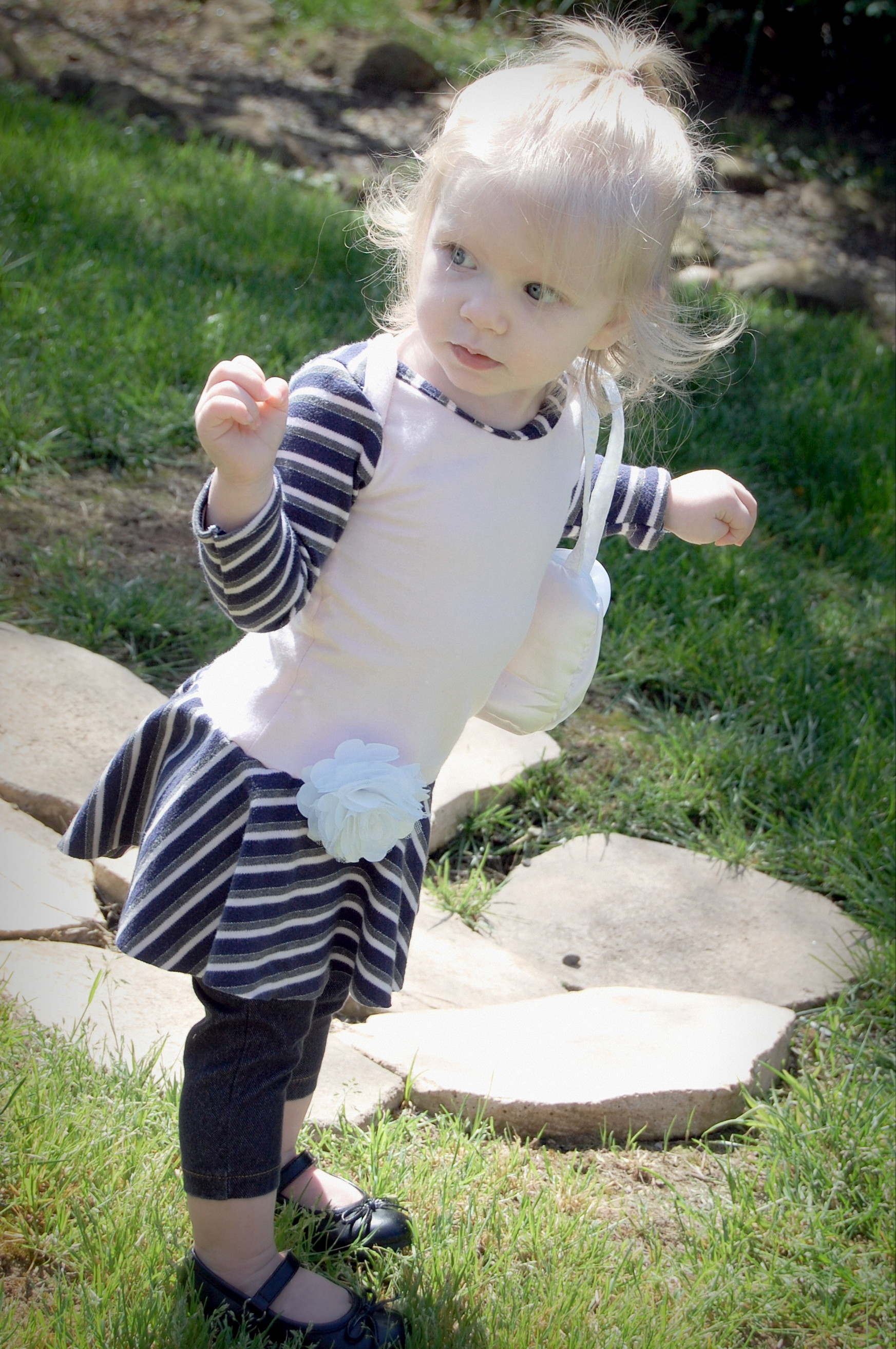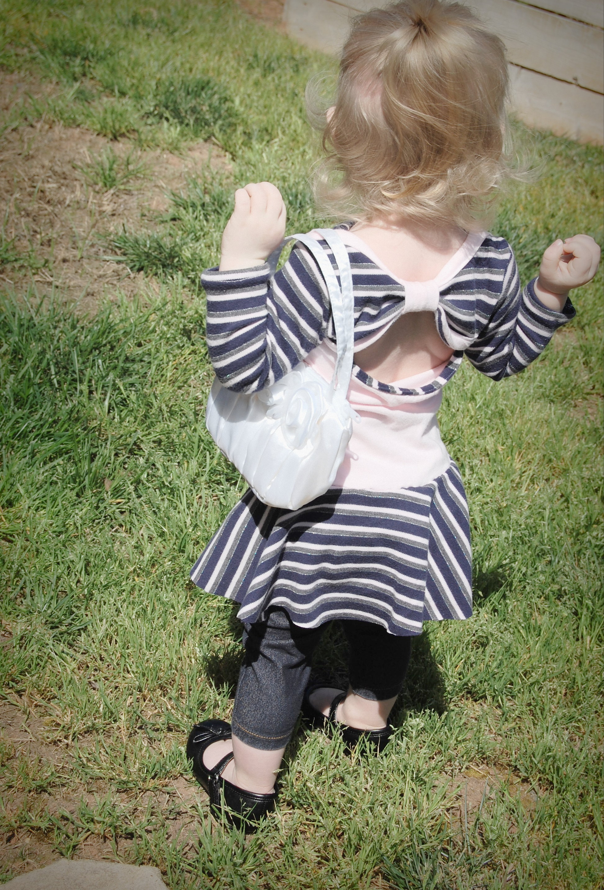 This bodysuit was much more of a challenge. The fabrics I used were really slinky and slippery. Originally, I thought I’d leave the peplum off on this one. I cut it anyway “just in case.” Because I was upcycling shirts, I accidentally cut the circle across a seam – even though I’d checked it three times to be sure that wasn’t the case. So…I did what anyone would do when I decided that I did, indeed , want the peplum. I cut the seam off, following the curve of the other side. I also was going to do arm bands on a sleeveless version – but, I decided that it wanted short sleeves. In fact, it needed short sleeves, so that’s what I did. I placed the peplum on with the shorter part on one side, and the longer on the other, so it would create a waterfall effect. For the pictures, I styled it over a Joe Fresh tutu and with Converse baby sneakers. I LOVE both so much. I’m already thinking about doing a third – the full dress version with the high low skirt that comes in Little Kiwi’s Closet’s Bow Back Beauty pattern. The pattern is for sizes NB-14. Designer Lydia Persson really amazes me with her talent.