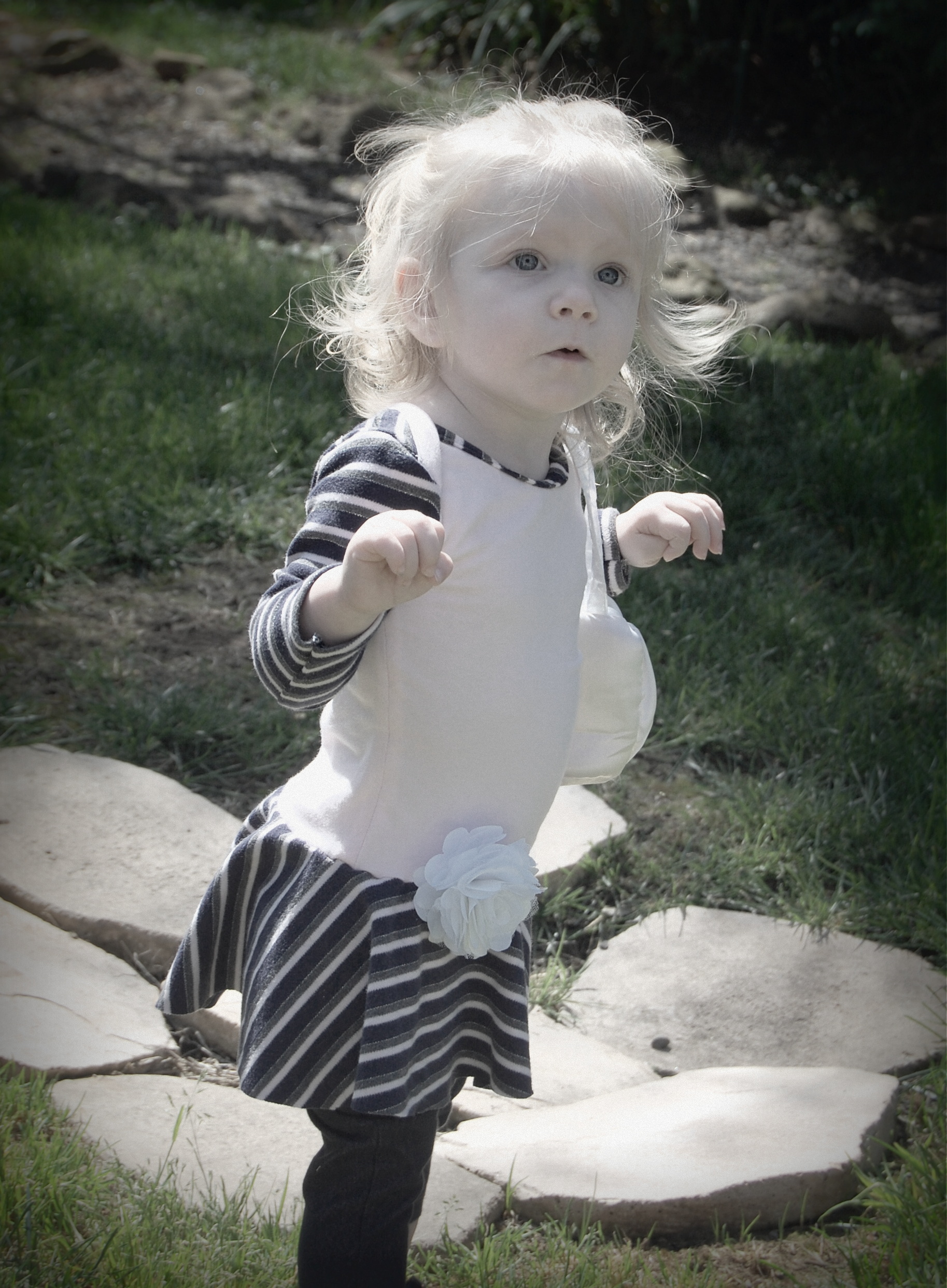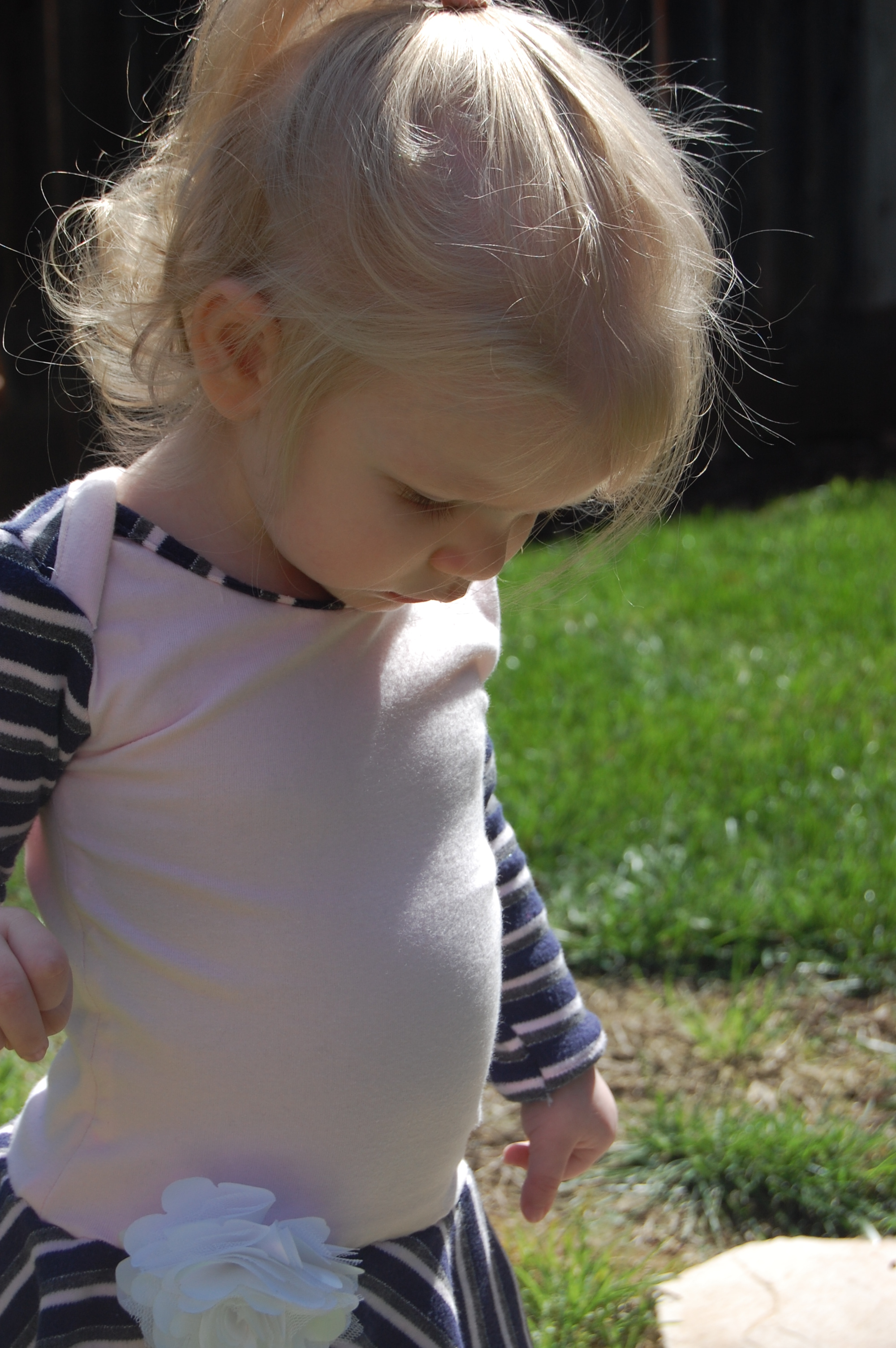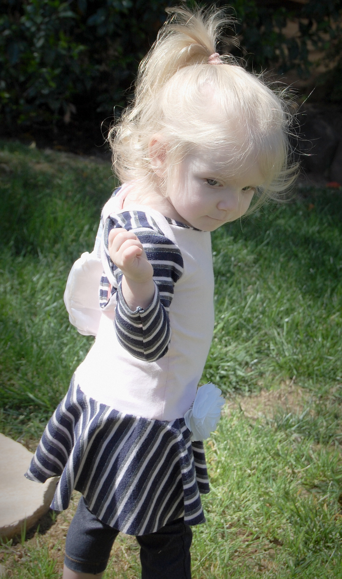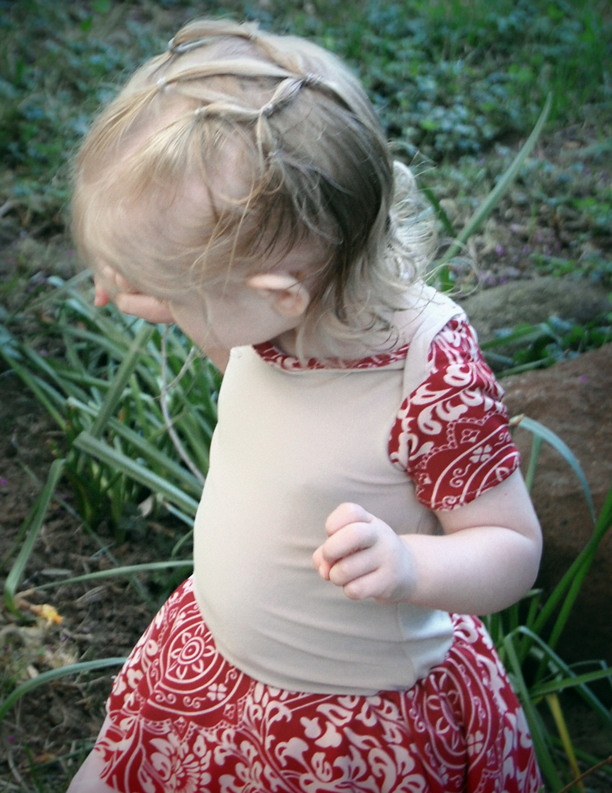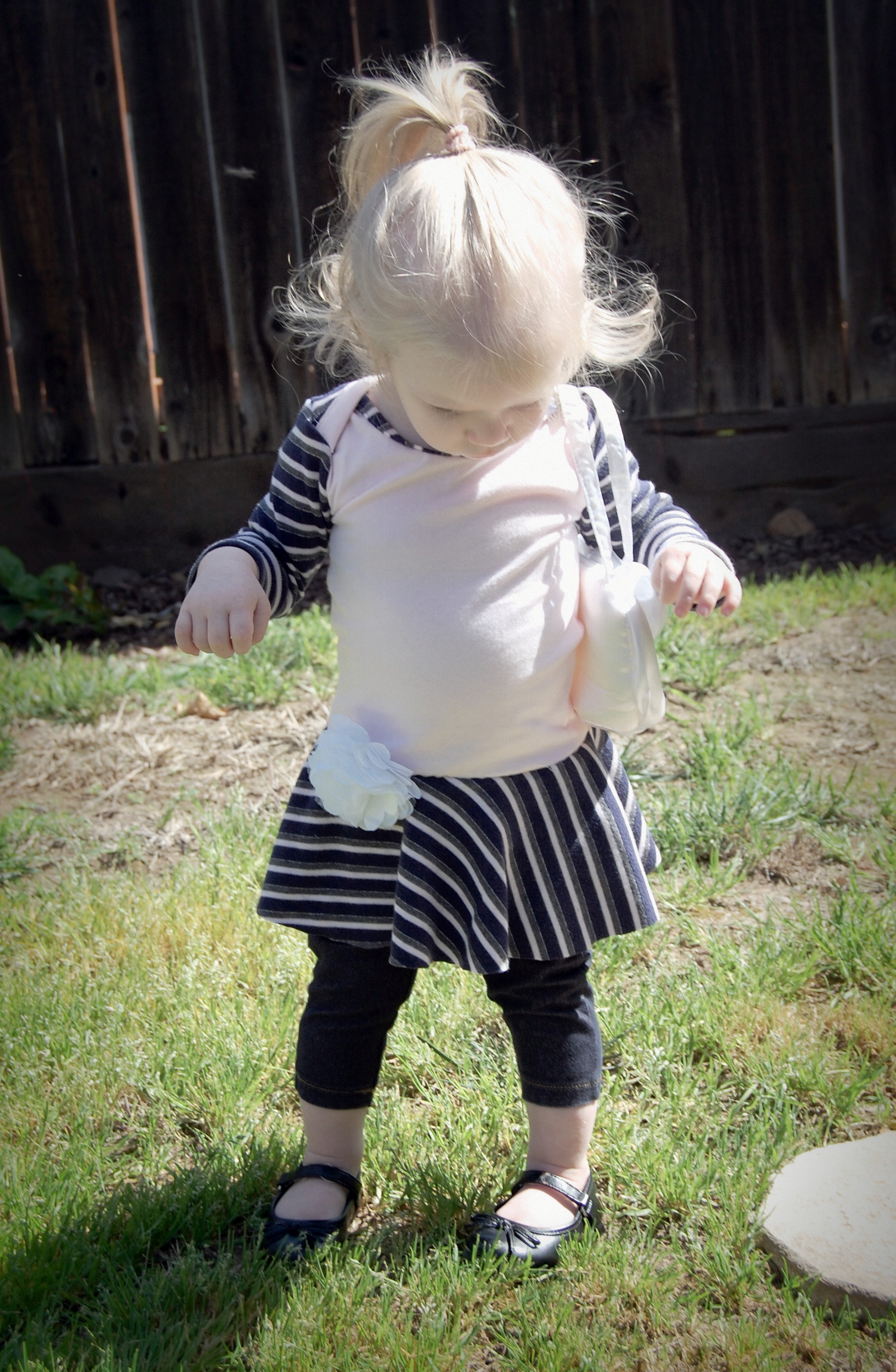 This bodysuit was much more of a challenge. The fabrics I used were really slinky and slippery. Originally, I thought I’d leave the peplum off on this one. I cut it anyway “just in case.” Because I was upcycling shirts, I accidentally cut the circle across a seam – even though I’d checked it three times to be sure that wasn’t the case. So…I did what anyone would do when I decided that I did, indeed , want the peplum. I cut the seam off, following the curve of the other side. I also was going to do arm bands on a sleeveless version – but, I decided that it wanted short sleeves. In fact, it needed short sleeves, so that’s what I did. I placed the peplum on with the shorter part on one side, and the longer on the other, so it would create a waterfall effect. For the pictures, I styled it over a Joe Fresh tutu and with Converse baby sneakers. I LOVE both so much. I’m already thinking about doing a third – the full dress version with the high low skirt that comes in Little Kiwi’s Closet’s Bow Back Beauty pattern. The pattern is for sizes NB-14. Designer Lydia Persson really amazes me with her talent.