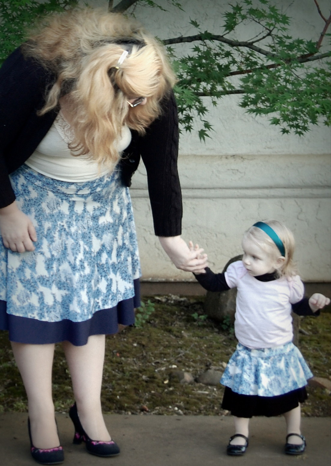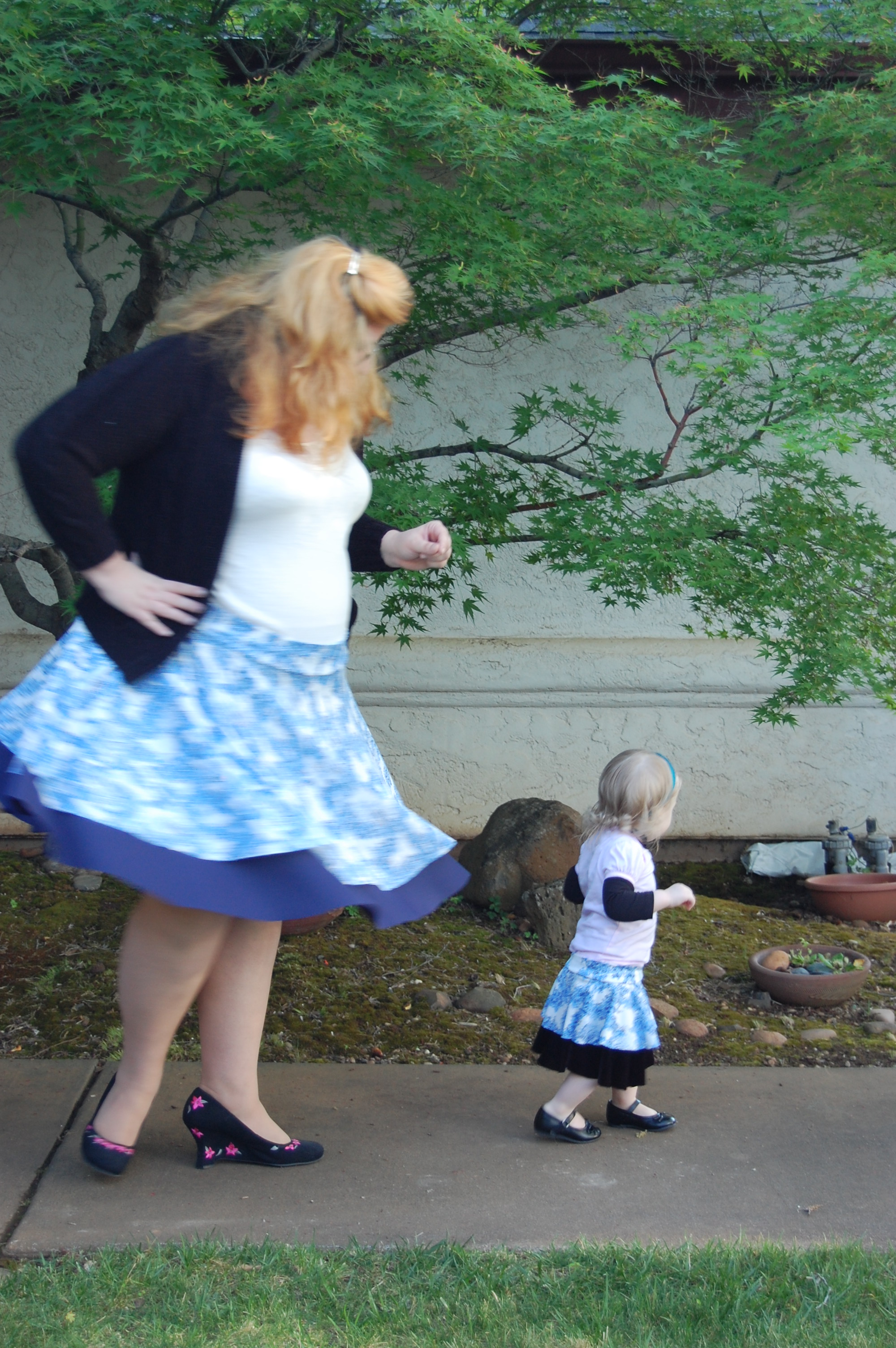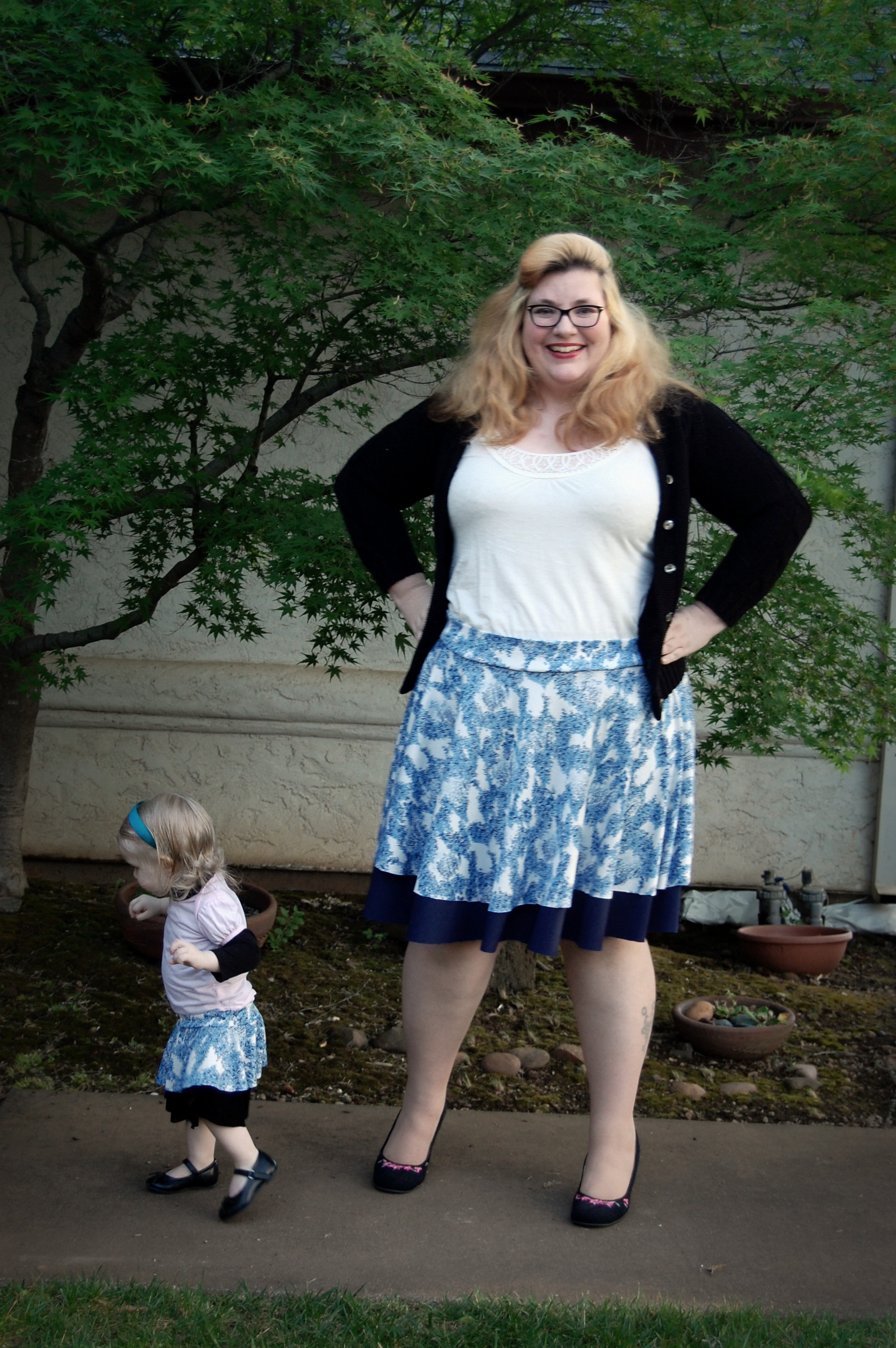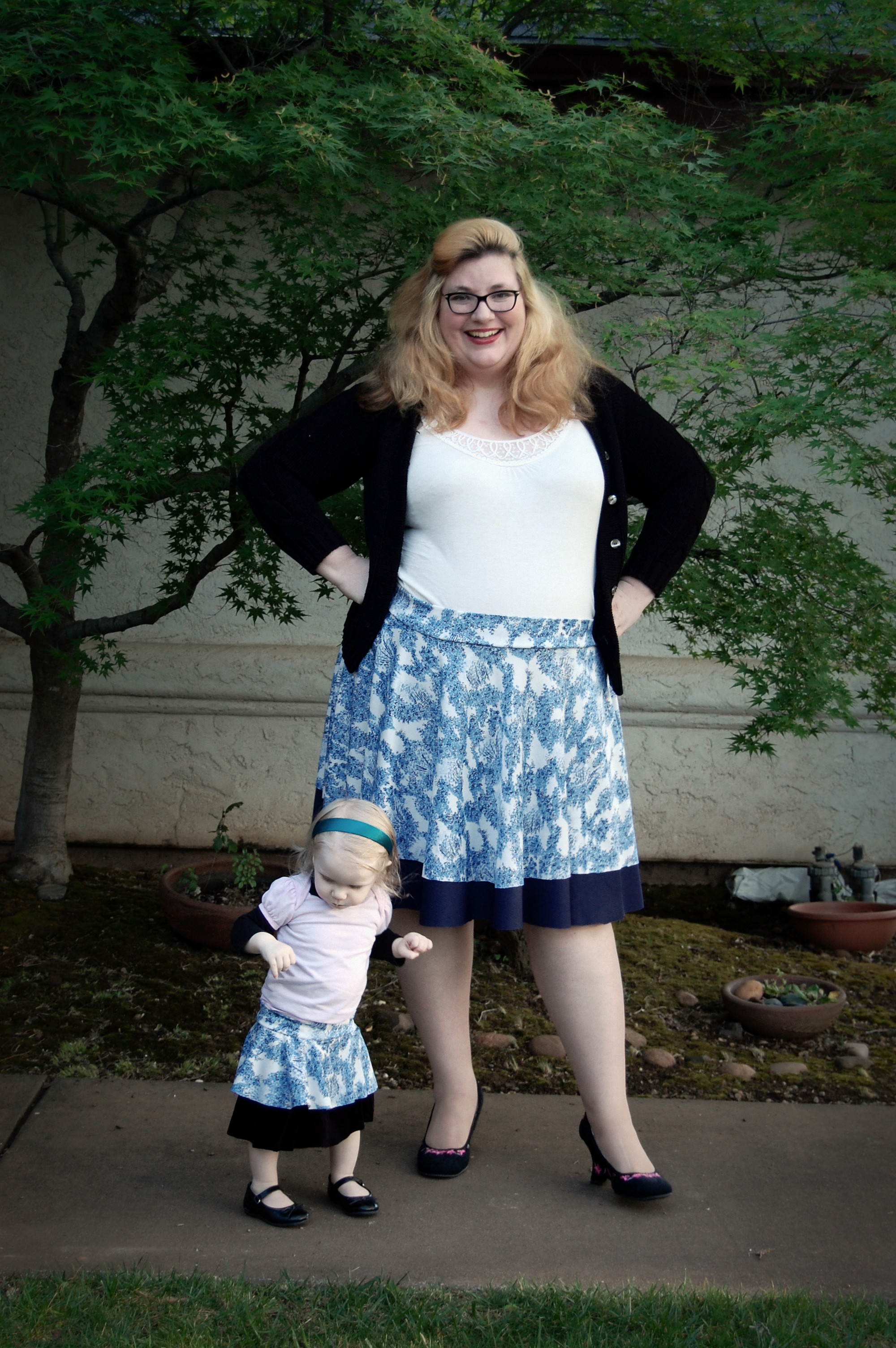Kelly’s Twirly Skirts from Bella Sunshine Designs (and a Big Announcement) Ronda Bowen, April 20, 2015 So the last post I wrote got a LOT of traffic and attention, and some great comments, and I want to talk about all of that – and I will – in a separate post. Thank you all so much for all of your support and for reading! I feel bad about taking some time to get back to the blog after posting it – but I was struck by a wave of extreme exhaustion that came out of nowhere, so it seemed. I could not, for the life of me, get any energy to do beyond what needed to be done. An announcement from Wining Wife Well, my friends, there’s a very good reason for this. It turns out that our family is growing! YAY! I’m super excited that Toddler Girl will be a big sister. And PHEW. There was a good reason for the exhaustion, and once I started paying attention to my iron intake it’s slowly dropping off. This is how we announced it and made things “Facebook official” after we talked to family members and close friends. What this means, dear readers, is that any wine reviews I post from here until the birth of our new little munchkin will be from notes that I’ve made previously. It also means that I’m going to be talking about plus size maternity clothes and sewing them…and preparing for a whole new person to be born…and other various shenanigans. And well a bunch of other really good things! Can you tell I’m excited? I can barely think straight! Onto the skirts! So whew! That’s really really exciting. In the midst of all of this exhaustion, I managed to sew a little bit. I did a pattern test for Bella Sunshine Designs (affiliate link), which I think came out really well. I tested both the women’s and the girls’ version of the skirts…and what better way to do it than make skirts that would coordinate with one another? The fabric for the skirts Okay, so I’ll admit that my fabric selection process took a little time. I wasn’t quite sure which fabric I wanted to use – and I had lots of ideas for fabrics that would work. Make. All. The. Skirts. Seriously, sometimes it’s really hard to choose what I’ll use for a project. It doesn’t help that my house is like a giant explosion of fabric right now. (I need to organize it soooooo bad…and don’t get me started on the sewing patterns). I digress. So I’d used the light blue on white print on a top I made for a Cake Patterns top that I’ll talk about in a future post on here, and I had a lot of it left. It’s a really nice, drapy, pretty fabric, that I thought would have good twirl factor. I still have a little of it left. It was, as you could guess, one of my thrift store finds. $3. I’m not even kidding. I keep meaning to do a thread test on it, because I suspect that it’s silk jersey. Anyway, so I have a ton of this fabric – what better project than making a couple of circle skirts? The problem was, I couldn’t decide what should go underneath. For a little bit, I considered a royal blue velour fabric. Yup. That would have been soooo spectacularly awful, I’m willing to bet. Well, maybe not awful, but not as great as the fabrics I wound up with. Let’s start with the toddler skirt: the bottom skirt is made out of black stretch velvet from an upcycled dress I had. I’d cut the bottom of the dress off to make myself a skirt. The bottom of my skirt is a vintage (as in 35″) knit fabric in a navy blue. I think it’s polyester. It has really awesome drape itself – and is nice and dark since the top fabric is so lightweight. The skirt patterns *All notes refer to the tester version of this skirt. I do have plans to make another set with the final version of the skirt.* The girls’ pattern has modesty shorts underneath – which is great for a toddler who is always very busy investigating things. The women’s pattern doesn’t, but I don’t have any burning desires to randomly pull my skirt up to investigate the fabric, either. I’ll just admire it in other ways. There are four pieces for the girls’ pattern and three for the adult pattern – shorts legs, bottom circle skirt, top circle skirt, and waistband. The women’s has the layers and the waistband. The patterns include sizes 12 months – 14 for girls and 0-20 for women’s. The 20 fit me a little loose, actually (which was surprising since I thought it would be tight…but that works out well for my purposes anyway! Mwahahahah!); the waist is 41 1/2 ” and hips are 50″ and my measurements at the time were 44″ and 53″. I think part of it is the stretch fabric I used, and given the fact that I want to wear this skirt while pregnant, that’s a good thing! My little gal is in the 12 months size. She’s a little peanut. She’s so petite! So it was a bit big on her waist as well. I added some elastic tape to the inside of both skirts to help hold it up (it has a yoga-style waistband), and that helped a lot! The skirts were easy to sew – I made both of them in an afternoon. Hemming took a little bit, but it always does on circle skirts. In the pictures, I’m wearing my grandmother’s cardigan and a camisole from Old Navy. My shoes are from Rampage. Toddler girl is wearing Circo shirts and Mary Janes that we found at thrift/consignment stores. As always, thanks for stopping by! I have good things in store for you soon! Share this:Share Share on Telegram (Opens in new window) Telegram Print (Opens in new window) Print Share on Reddit (Opens in new window) Reddit Share on WhatsApp (Opens in new window) WhatsApp Share on Tumblr (Opens in new window) Tumblr Email a link to a friend (Opens in new window) Email Share on LinkedIn (Opens in new window) LinkedIn Share on Pinterest (Opens in new window) Pinterest Share on Facebook (Opens in new window) Facebook Share on X (Opens in new window) X Like this:Like Loading... Related Hobbies and Crafts sewing