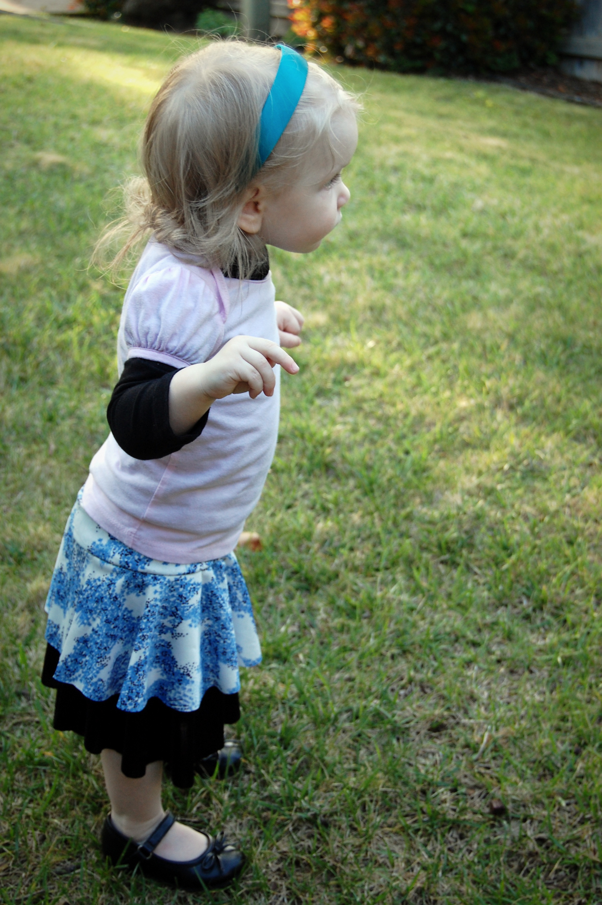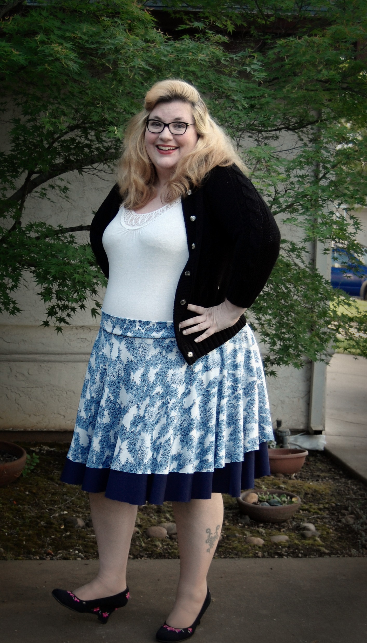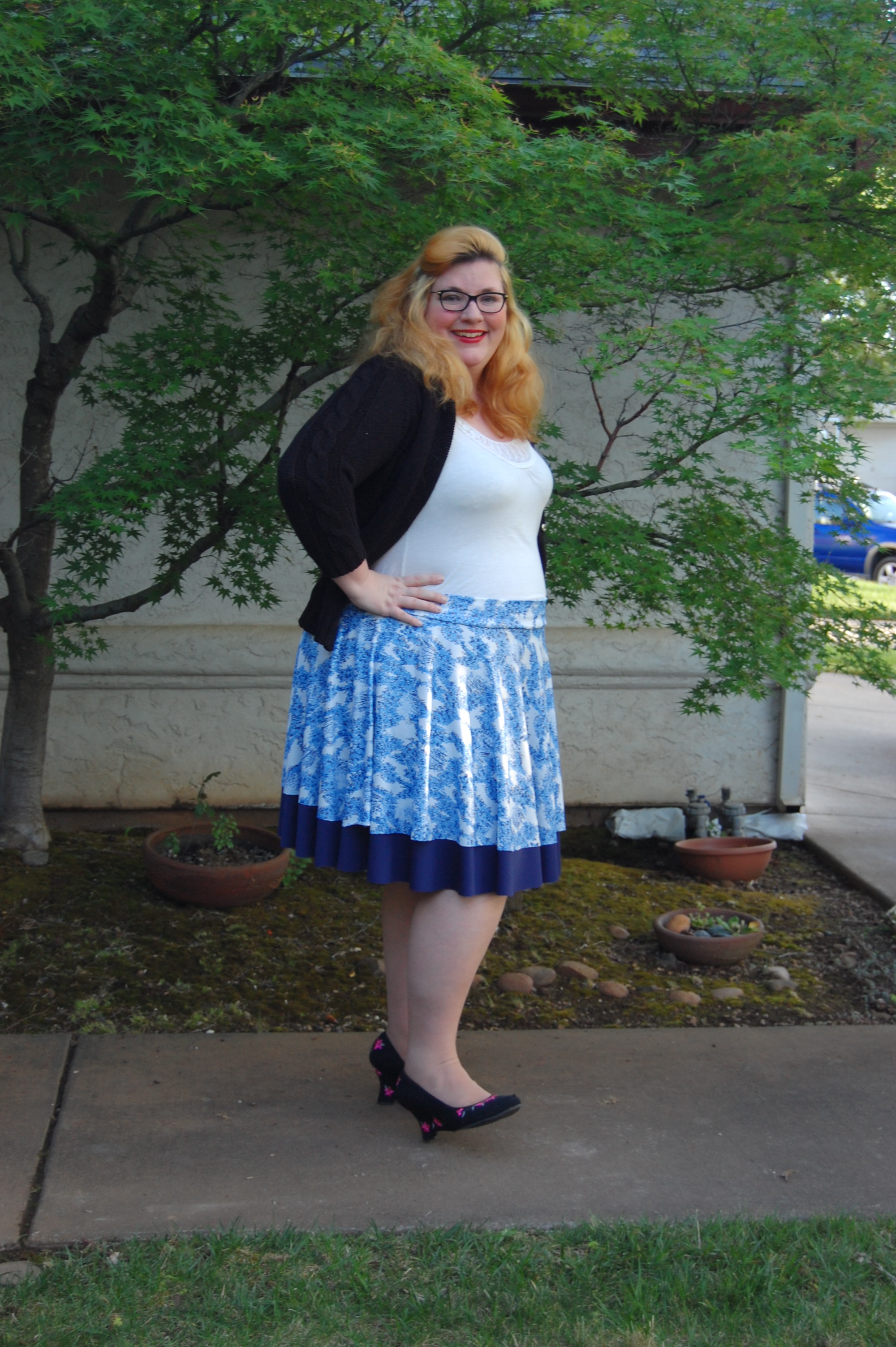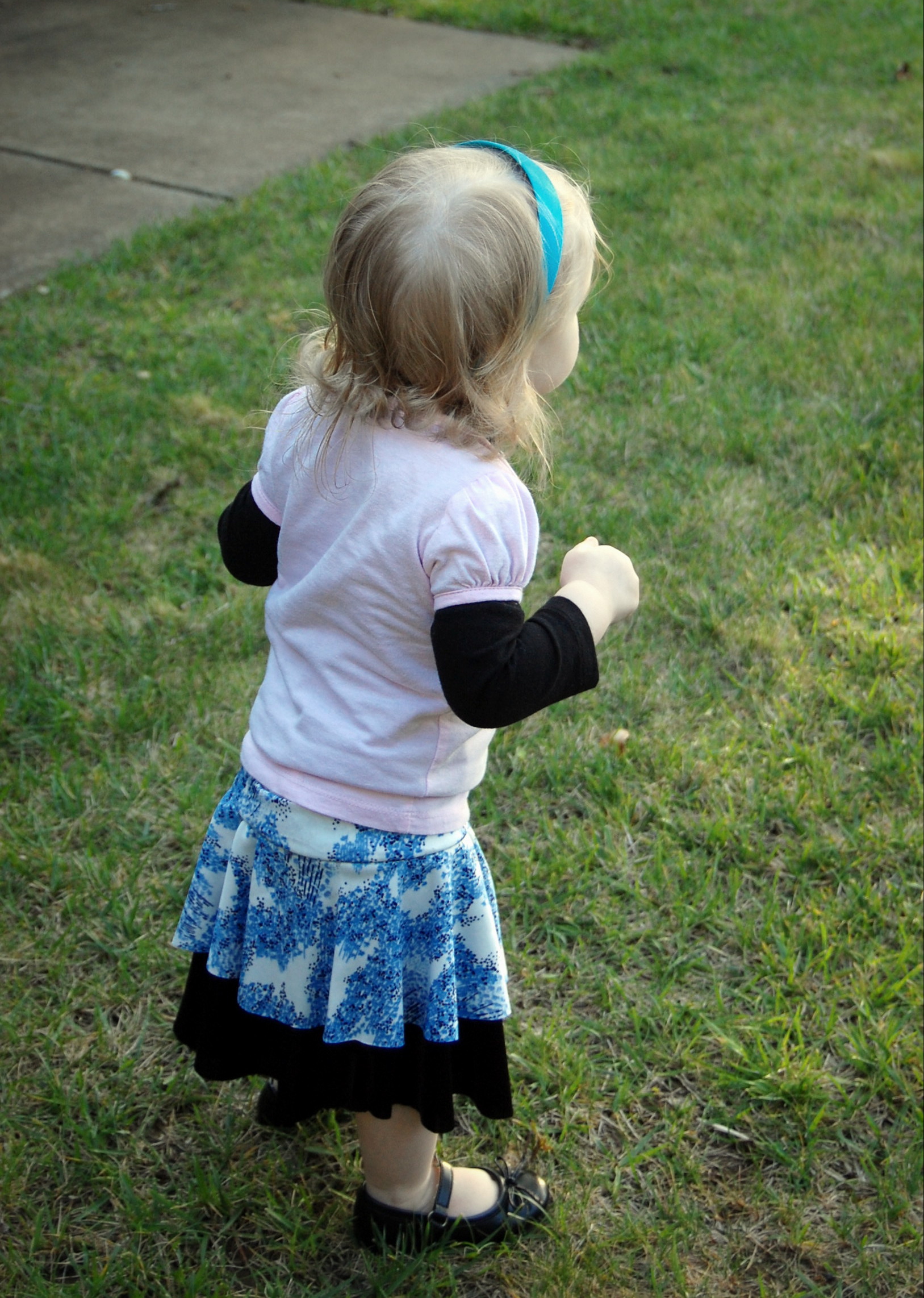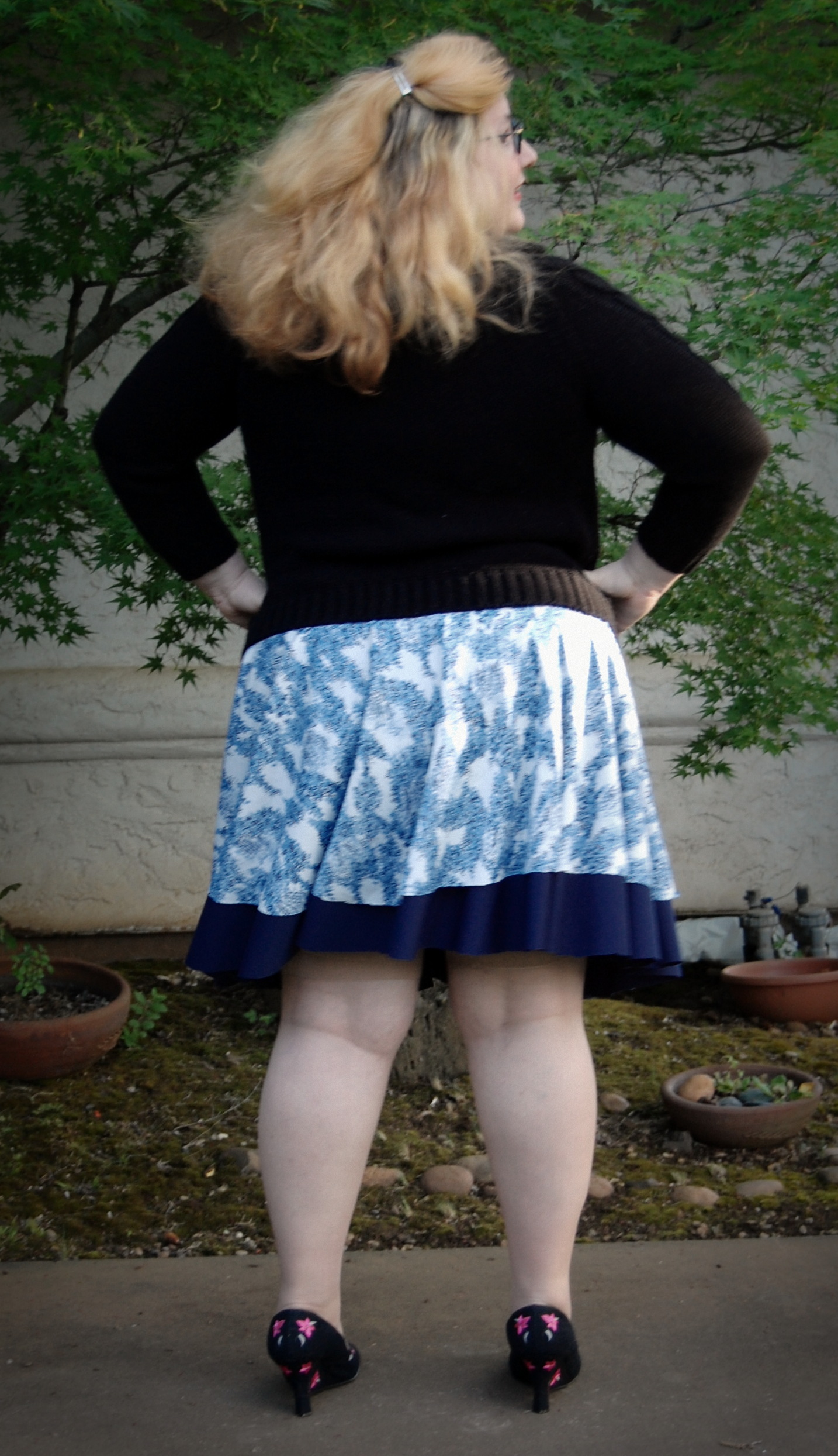 Kelly’s Twirly Skirts from Bella Sunshine Designs (and a Big Announcement) Ronda Bowen, April 20, 2015 So the last post I wrote got a LOT of traffic and attention, and some great comments, and I want to talk about all of that – and I will – in a separate post. Thank you all so much for all of your support and for reading! I feel bad about taking some time to get back to the blog after posting it – but I was struck by a wave of extreme exhaustion that came out of nowhere, so it seemed. I could not, for the life of me, get any energy to do beyond what needed to be done. An announcement from Wining Wife Well, my friends, there’s a very good reason for this. It turns out that our family is growing! YAY! I’m super excited that Toddler Girl will be a big sister. And PHEW. There was a good reason for the exhaustion, and once I started paying attention to my iron intake it’s slowly dropping off. This is how we announced it and made things “Facebook official” after we talked to family members and close friends. What this means, dear readers, is that any wine reviews I post from here until the birth of our new little munchkin will be from notes that I’ve made previously. It also means that I’m going to be talking about plus size maternity clothes and sewing them…and preparing for a whole new person to be born…and other various shenanigans. And well a bunch of other really good things! Can you tell I’m excited? I can barely think straight! Onto the skirts! So whew! That’s really really exciting. In the midst of all of this exhaustion, I managed to sew a little bit. I did a pattern test for Bella Sunshine Designs (affiliate link), which I think came out really well. I tested both the women’s and the girls’ version of the skirts…and what better way to do it than make skirts that would coordinate with one another? The fabric for the skirts Okay, so I’ll admit that my fabric selection process took a little time. I wasn’t quite sure which fabric I wanted to use – and I had lots of ideas for fabrics that would work. Make. All. The. Skirts. Seriously, sometimes it’s really hard to choose what I’ll use for a project. It doesn’t help that my house is like a giant explosion of fabric right now. (I need to organize it soooooo bad…and don’t get me started on the sewing patterns). I digress. So I’d used the light blue on white print on a top I made for a Cake Patterns top that I’ll talk about in a future post on here, and I had a lot of it left. It’s a really nice, drapy, pretty fabric, that I thought would have good twirl factor. I still have a little of it left. It was, as you could guess, one of my thrift store finds. $3. I’m not even kidding. I keep meaning to do a thread test on it, because I suspect that it’s silk jersey. Anyway, so I have a ton of this fabric – what better project than making a couple of circle skirts? The problem was, I couldn’t decide what should go underneath. For a little bit, I considered a royal blue velour fabric. Yup. That would have been soooo spectacularly awful, I’m willing to bet. Well, maybe not awful, but not as great as the fabrics I wound up with. Let’s start with the toddler skirt: the bottom skirt is made out of black stretch velvet from an upcycled dress I had. I’d cut the bottom of the dress off to make myself a skirt. The bottom of my skirt is a vintage (as in 35″) knit fabric in a navy blue. I think it’s polyester. It has really awesome drape itself – and is nice and dark since the top fabric is so lightweight. The skirt patterns *All notes refer to the tester version of this skirt. I do have plans to make another set with the final version of the skirt.* The girls’ pattern has modesty shorts underneath – which is great for a toddler who is always very busy investigating things. The women’s pattern doesn’t, but I don’t have any burning desires to randomly pull my skirt up to investigate the fabric, either. I’ll just admire it in other ways. There are four pieces for the girls’ pattern and three for the adult pattern – shorts legs, bottom circle skirt, top circle skirt, and waistband. The women’s has the layers and the waistband. The patterns include sizes 12 months – 14 for girls and 0-20 for women’s. The 20 fit me a little loose, actually (which was surprising since I thought it would be tight…but that works out well for my purposes anyway! Mwahahahah!); the waist is 41 1/2 ” and hips are 50″ and my measurements at the time were 44″ and 53″. I think part of it is the stretch fabric I used, and given the fact that I want to wear this skirt while pregnant, that’s a good thing! My little gal is in the 12 months size. She’s a little peanut. She’s so petite! So it was a bit big on her waist as well. I added some elastic tape to the inside of both skirts to help hold it up (it has a yoga-style waistband), and that helped a lot! The skirts were easy to sew – I made both of them in an afternoon. Hemming took a little bit, but it always does on circle skirts. In the pictures, I’m wearing my grandmother’s cardigan and a camisole from Old Navy. My shoes are from Rampage. Toddler girl is wearing Circo shirts and Mary Janes that we found at thrift/consignment stores. As always, thanks for stopping by! I have good things in store for you soon! Share this:Share Share on Telegram (Opens in new window) Telegram Print (Opens in new window) Print Share on Reddit (Opens in new window) Reddit Share on WhatsApp (Opens in new window) WhatsApp Share on Tumblr (Opens in new window) Tumblr Email a link to a friend (Opens in new window) Email Share on LinkedIn (Opens in new window) LinkedIn Share on Pinterest (Opens in new window) Pinterest Share on Facebook (Opens in new window) Facebook Share on X (Opens in new window) X Like this:Like Loading... Related Hobbies and Crafts sewing