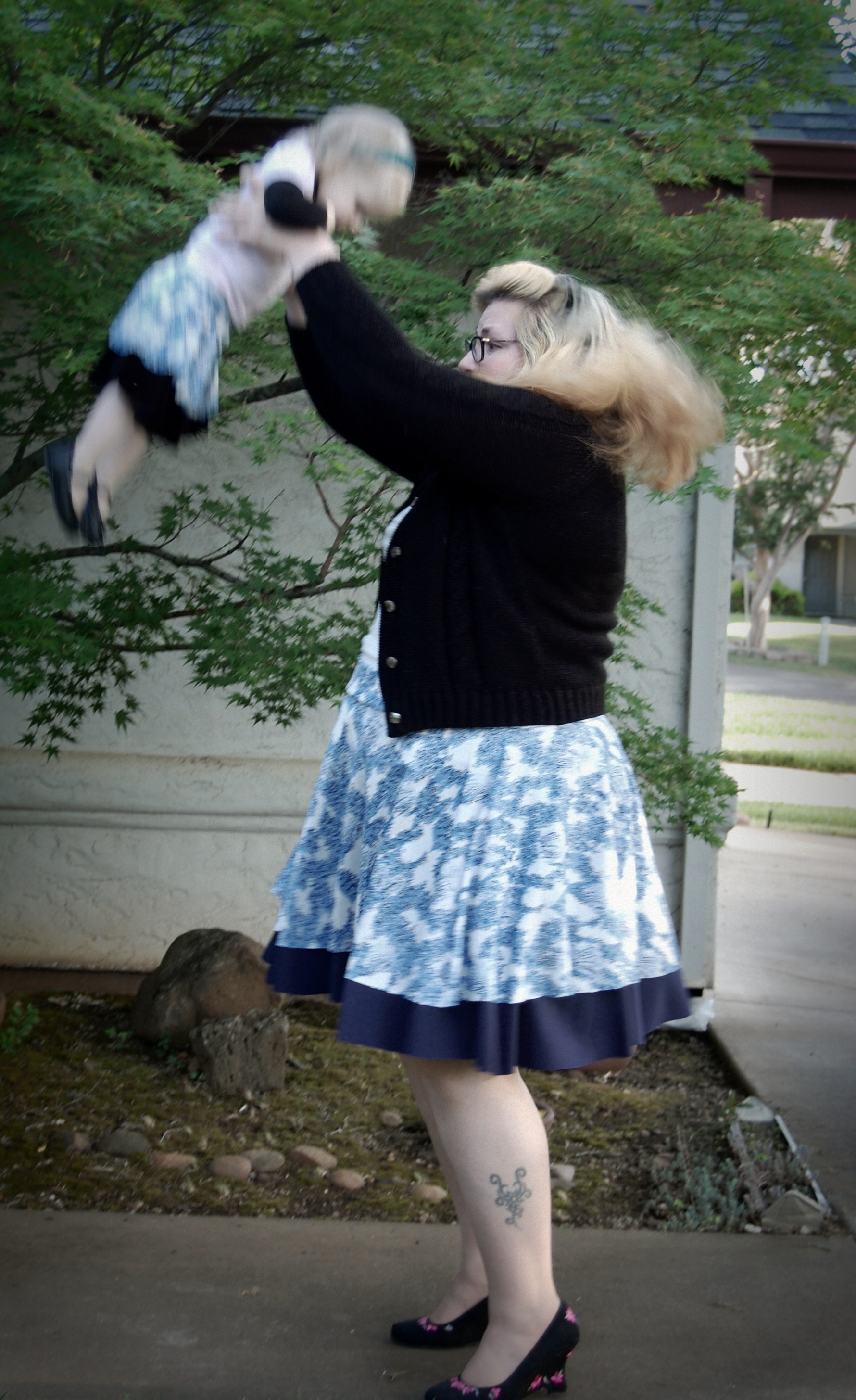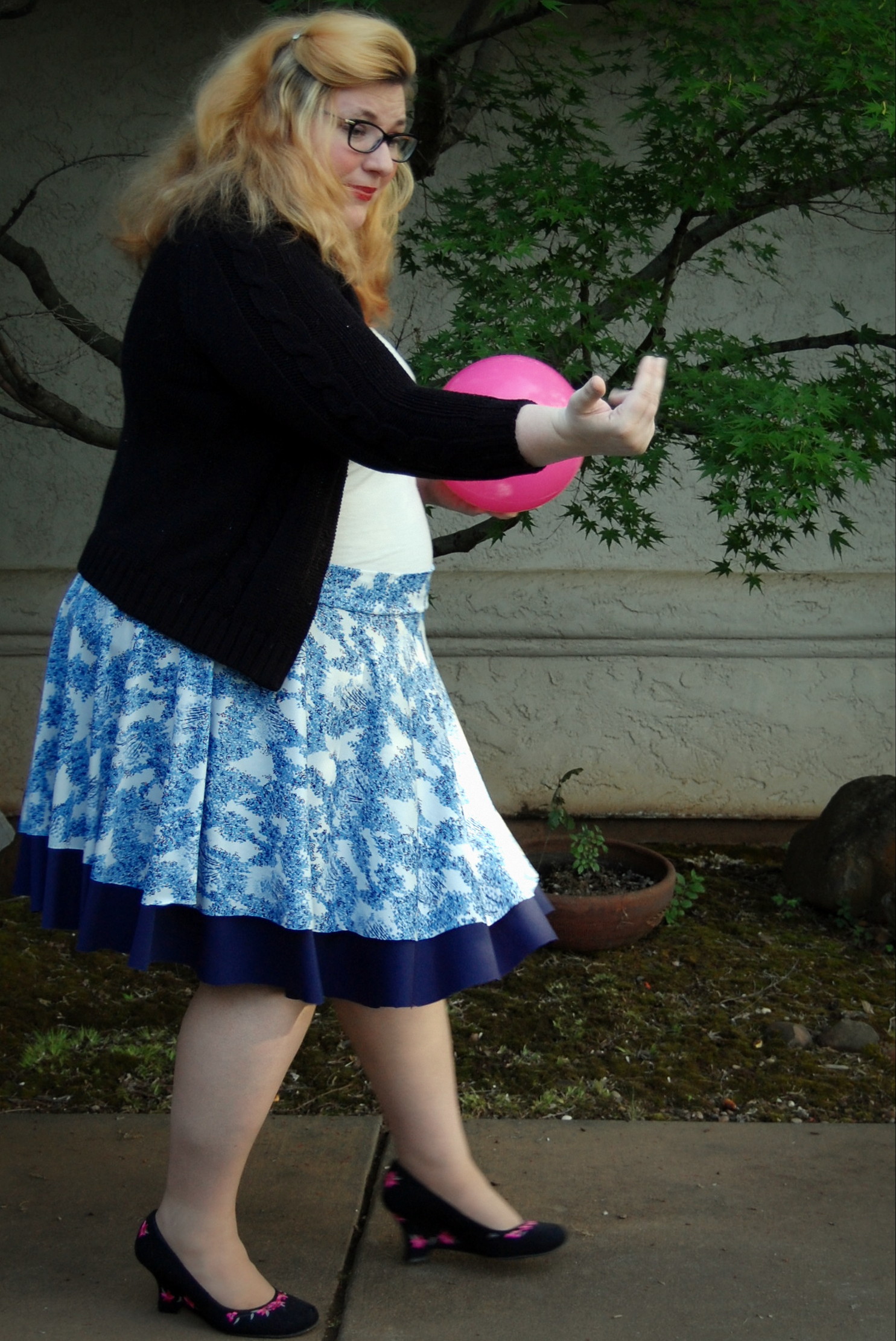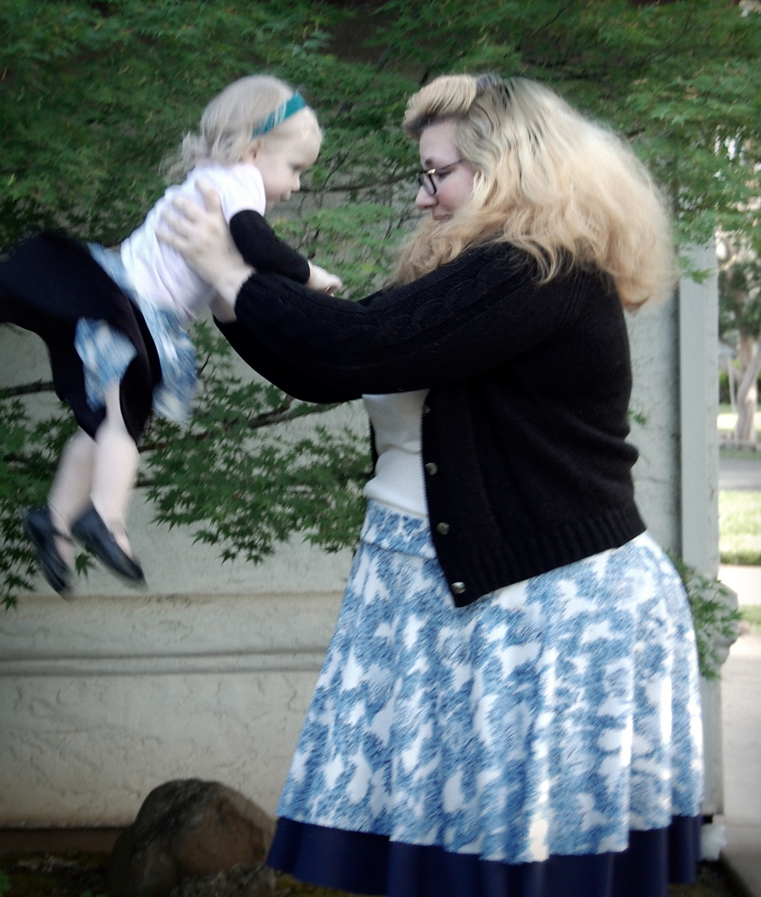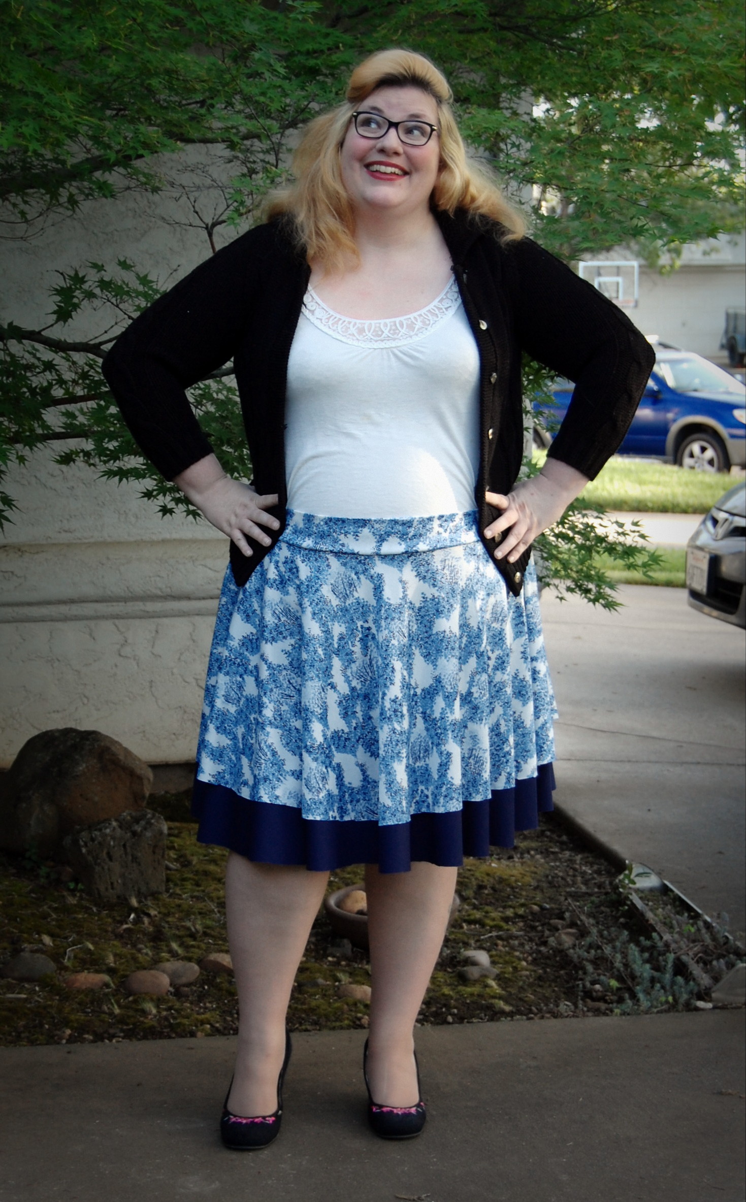 Kelly’s Twirly Skirts from Bella Sunshine Designs (and a Big Announcement) Ronda Bowen, April 20, 2015 So the last post I wrote got a LOT of traffic and attention, and some great comments, and I want to talk about all of that – and I will – in a separate post. Thank you all so much for all of your support and for reading! I feel bad about taking some time to get back to the blog after posting it – but I was struck by a wave of extreme exhaustion that came out of nowhere, so it seemed. I could not, for the life of me, get any energy to do beyond what needed to be done. An announcement from Wining Wife Well, my friends, there’s a very good reason for this. It turns out that our family is growing! YAY! I’m super excited that Toddler Girl will be a big sister. And PHEW. There was a good reason for the exhaustion, and once I started paying attention to my iron intake it’s slowly dropping off. This is how we announced it and made things “Facebook official” after we talked to family members and close friends. What this means, dear readers, is that any wine reviews I post from here until the birth of our new little munchkin will be from notes that I’ve made previously. It also means that I’m going to be talking about plus size maternity clothes and sewing them…and preparing for a whole new person to be born…and other various shenanigans. And well a bunch of other really good things! Can you tell I’m excited? I can barely think straight! Onto the skirts! So whew! That’s really really exciting. In the midst of all of this exhaustion, I managed to sew a little bit. I did a pattern test for Bella Sunshine Designs (affiliate link), which I think came out really well. I tested both the women’s and the girls’ version of the skirts…and what better way to do it than make skirts that would coordinate with one another? The fabric for the skirts Okay, so I’ll admit that my fabric selection process took a little time. I wasn’t quite sure which fabric I wanted to use – and I had lots of ideas for fabrics that would work. Make. All. The. Skirts. Seriously, sometimes it’s really hard to choose what I’ll use for a project. It doesn’t help that my house is like a giant explosion of fabric right now. (I need to organize it soooooo bad…and don’t get me started on the sewing patterns). I digress. So I’d used the light blue on white print on a top I made for a Cake Patterns top that I’ll talk about in a future post on here, and I had a lot of it left. It’s a really nice, drapy, pretty fabric, that I thought would have good twirl factor. I still have a little of it left. It was, as you could guess, one of my thrift store finds. $3. I’m not even kidding. I keep meaning to do a thread test on it, because I suspect that it’s silk jersey. Anyway, so I have a ton of this fabric – what better project than making a couple of circle skirts? The problem was, I couldn’t decide what should go underneath. For a little bit, I considered a royal blue velour fabric. Yup. That would have been soooo spectacularly awful, I’m willing to bet. Well, maybe not awful, but not as great as the fabrics I wound up with. Let’s start with the toddler skirt: the bottom skirt is made out of black stretch velvet from an upcycled dress I had. I’d cut the bottom of the dress off to make myself a skirt. The bottom of my skirt is a vintage (as in 35″) knit fabric in a navy blue. I think it’s polyester. It has really awesome drape itself – and is nice and dark since the top fabric is so lightweight. The skirt patterns *All notes refer to the tester version of this skirt. I do have plans to make another set with the final version of the skirt.* The girls’ pattern has modesty shorts underneath – which is great for a toddler who is always very busy investigating things. The women’s pattern doesn’t, but I don’t have any burning desires to randomly pull my skirt up to investigate the fabric, either. I’ll just admire it in other ways. There are four pieces for the girls’ pattern and three for the adult pattern – shorts legs, bottom circle skirt, top circle skirt, and waistband. The women’s has the layers and the waistband. The patterns include sizes 12 months – 14 for girls and 0-20 for women’s. The 20 fit me a little loose, actually (which was surprising since I thought it would be tight…but that works out well for my purposes anyway! Mwahahahah!); the waist is 41 1/2 ” and hips are 50″ and my measurements at the time were 44″ and 53″. I think part of it is the stretch fabric I used, and given the fact that I want to wear this skirt while pregnant, that’s a good thing! My little gal is in the 12 months size. She’s a little peanut. She’s so petite! So it was a bit big on her waist as well. I added some elastic tape to the inside of both skirts to help hold it up (it has a yoga-style waistband), and that helped a lot! The skirts were easy to sew – I made both of them in an afternoon. Hemming took a little bit, but it always does on circle skirts. In the pictures, I’m wearing my grandmother’s cardigan and a camisole from Old Navy. My shoes are from Rampage. Toddler girl is wearing Circo shirts and Mary Janes that we found at thrift/consignment stores. As always, thanks for stopping by! I have good things in store for you soon! Share this:Share Share on Telegram (Opens in new window) Telegram Print (Opens in new window) Print Share on Reddit (Opens in new window) Reddit Share on WhatsApp (Opens in new window) WhatsApp Share on Tumblr (Opens in new window) Tumblr Email a link to a friend (Opens in new window) Email Share on LinkedIn (Opens in new window) LinkedIn Share on Pinterest (Opens in new window) Pinterest Share on Facebook (Opens in new window) Facebook Share on X (Opens in new window) X Like this:Like Loading... Related Hobbies and Crafts sewing