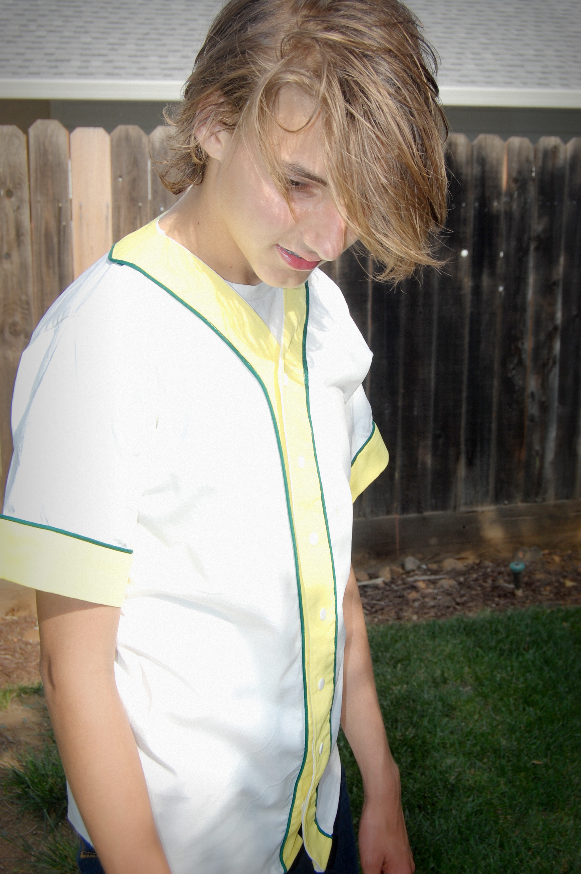 Like I mentioned, The Teenager is a huge fan of the Oakland Athletics, so it was a given that I would do the shirt in the team’s colors. I originally had found some *great* baseball jersey like fabric at Goodwill a few weeks ago – but he said “Meh, Wrah, I want a white jersey.” So, I’ve set the gray aside to make Wining Husband a Mariners-themed jersey. I went to the fabric store and looked for my notions. I could only find a lemon-yellow piping (here’s where having that piping foot would be awesome), so I decided I’d do the piping green and the contrast cuffs and facing in yellow. I grabbed the yellow and white twill, and I was on my way. I have a vintage A’s patch on order (I’ll apply it later since there are rules about that stuff) and I’ll put the number “52” on the back for him (Yoenis Cespedes’ number…yes, he was traded, but he’s still my son’s favorite ball player).