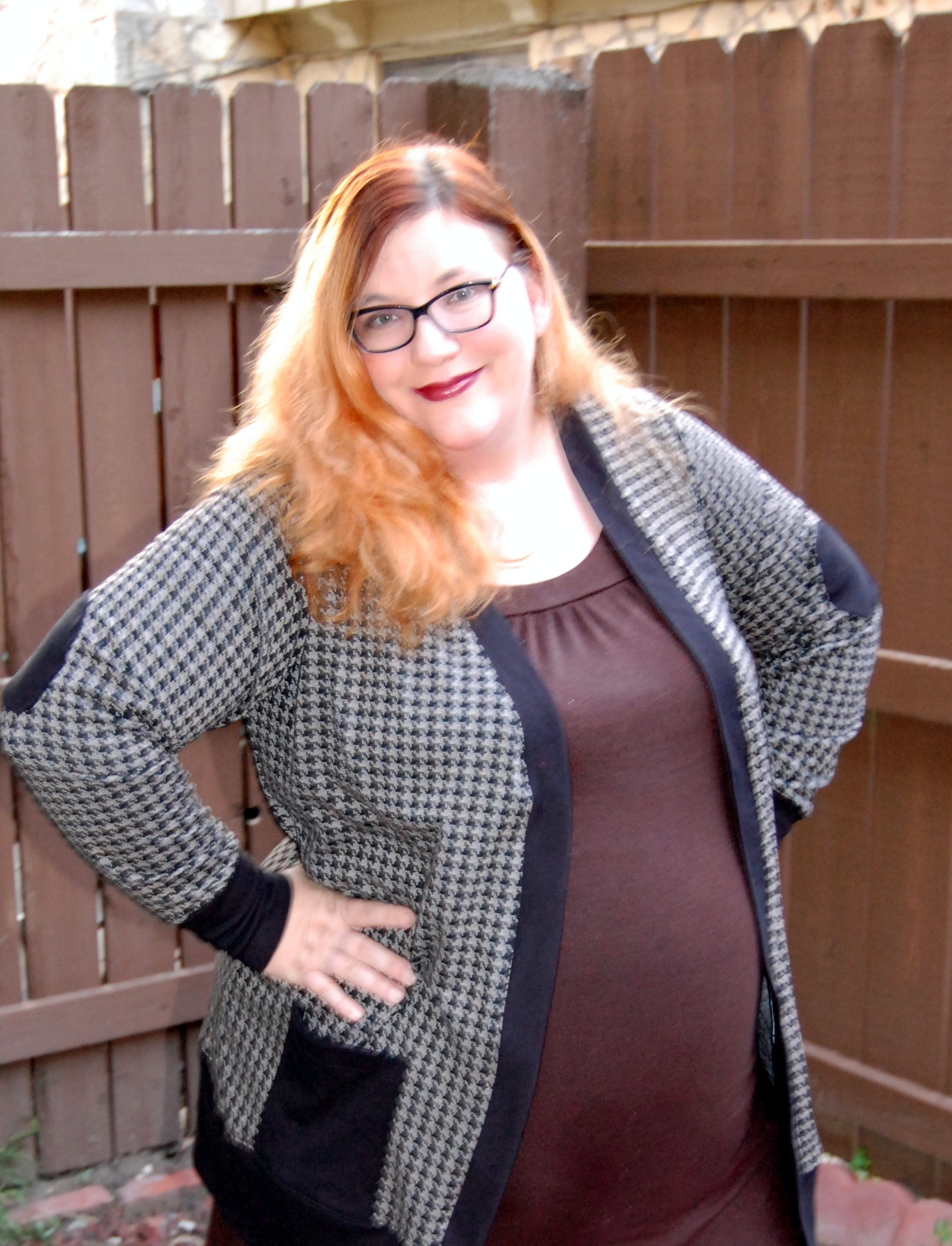 Who doesn’t love a good cardigan? I know I’m a big fan, and I wear them a lot of the year. When Judy Hale at Patterns for Pirates did a tester call for a cardigan pattern for women and children, I was really excited and had to sign right up. I had some more of the houndstooth fabric left from when I made the Phresh Jeggings, and I figured it would make a great cardigan for my little gal – and – one for myself. This was an easy pattern to stitch up, and the fabric I worked with (from Hancock Fabrics) was amazing. I’ve found myself addicted to their knits, actually. They sew up really nice and feel great. Plus, I’ve found the customer service at our local Hancock Fabrics to be above and beyond what I’ve experienced in the past at fabric store chains.Setting aside my raving about finding fabric that my machine doesn’t want to eat, I love this pattern. You can make it with short, 3/4 or long sleeves, add pockets with bands (or no bands as I did), add a hem band, make it tunic or waist length, and eve add those professorial elbow patches. It’s an easy pattern to make. I have a purple argyle sweater knit that I’m planning to use to make Little Miss another cardigan from, and I have a couple of fabrics hanging out that I was thinking of using for a cardigan for myself. The fit, as always is great on Judy’s designs. I wish I’d graded out to a Plus 3X on the hips though, since they’ve decided they’re going to do their thing while I’m pregnant. But, I wasn’t planning on buttoning the cardigan anyway right now.
