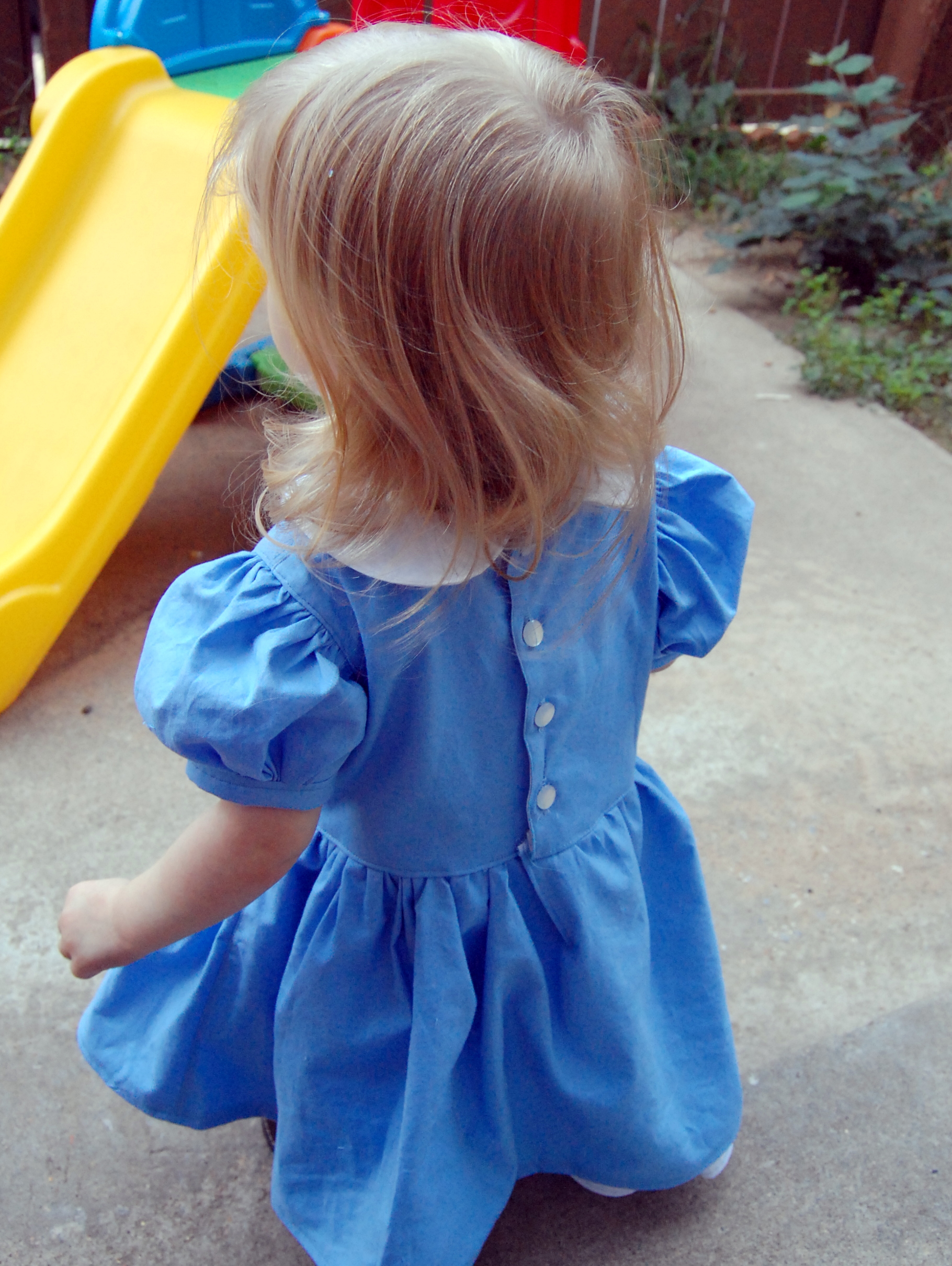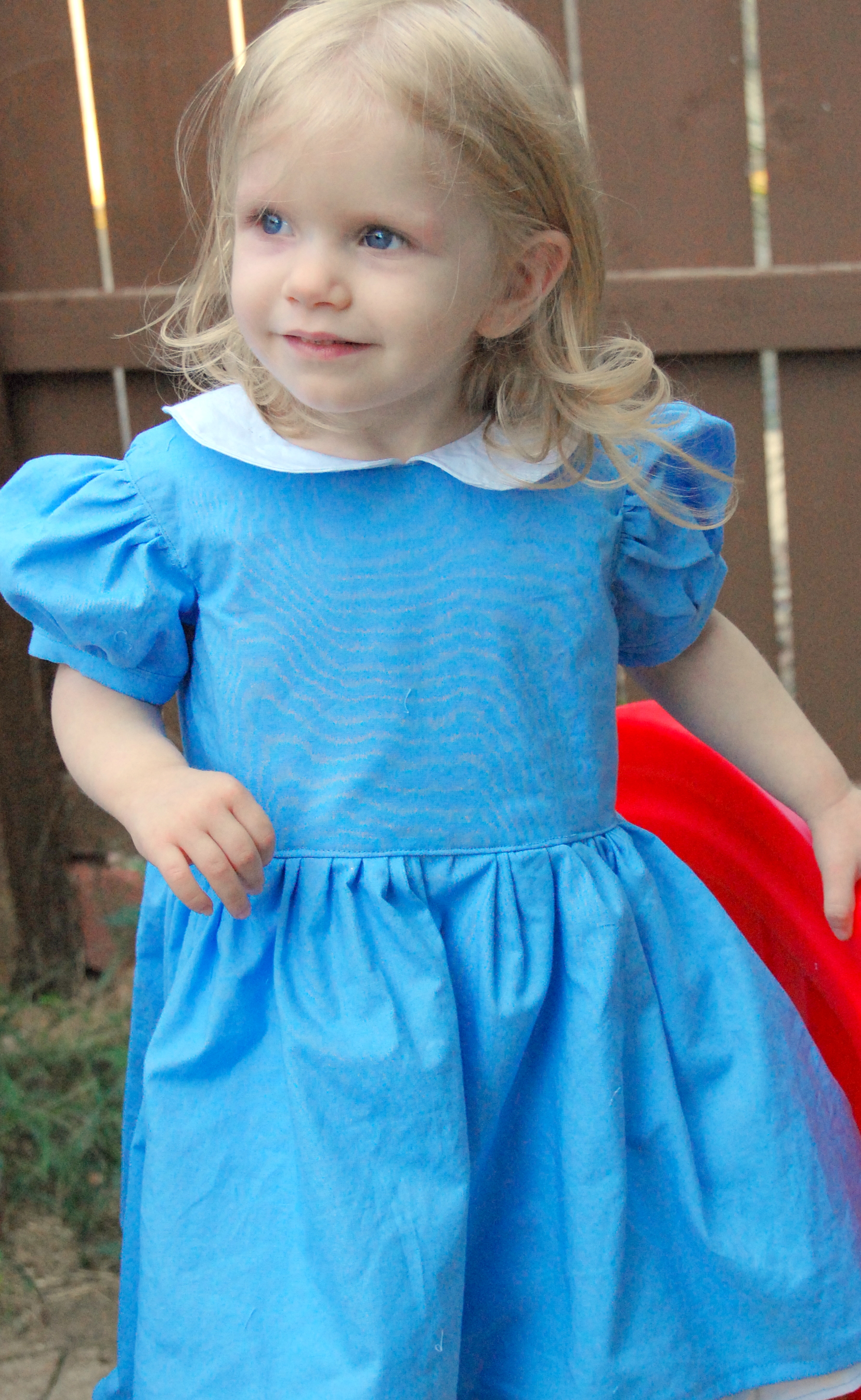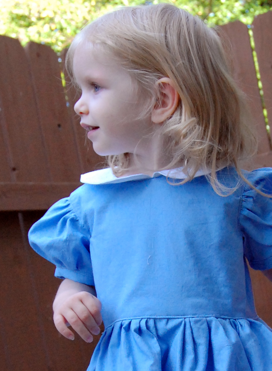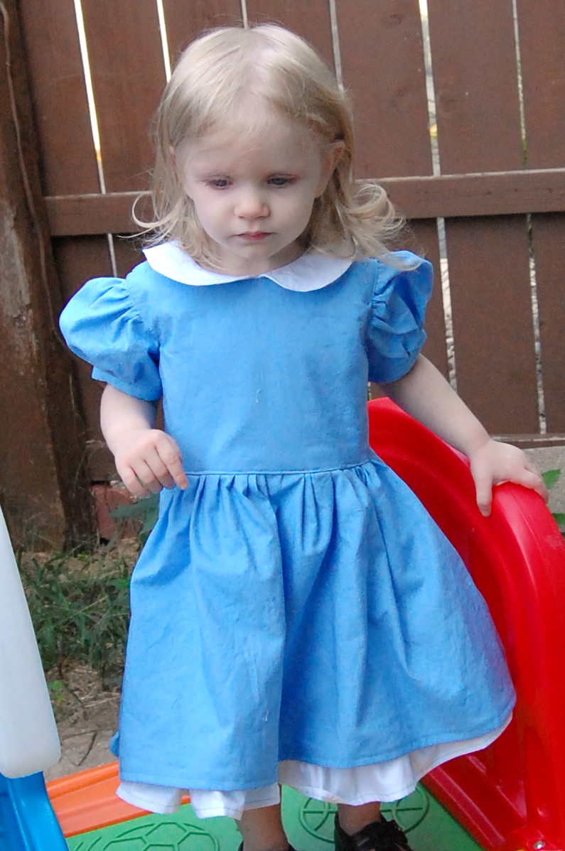 Mandy K Designs Knock Offs and Costume Hacks Tour: Alice in Wonderland Dress – Part I: The Dress Ronda Bowen, October 6, 2015October 6, 2015 I was inspired by Mandy K. Designs’ English Rose dress to create an Alice in Wonderland Halloween costume for Little Miss. I really can’t wait to share it with you, and I apologize sincerely for the delay in getting the pictures and the write-up of it up. I’ve been a bit under the weather lately, Little Miss is refusing to sleep at night, and I still have client work to take care of. All of that makes for a lot of excuses, but suffice it to say, I’ve been beyond exhausted lately. The English Rose Dress by Mandy K Designs I’ve been wanting to make an English Rose dress for a while now. I love the big bow and the full skirt, and I think it just looks like everything girl. There are some different options for the dress – you can have a scalloped collar, a Peter Pan collar, or no collar, you can have sleeves or no sleeves, you can have a hem with tulle, a ruffle, or scallopped ruffle, and you can have a simple or pleated sash. The pattern is $8.95, but if you purchase it now through October 11th, you can get 30% off with the code: MKDblogtour2015. (I received the pattern I’m talking about in exchange for participating in this tour; this is not an affiliate link). I’m also a big fan of Alice In Wonderland, and given Little Miss’s longish blonde hair (I still can’t believe she’s not even 2 yet), I thought that this dress would make a great Alice in Wonderland-style dress for Halloween. I’ve made a pair of stretch lace tights and I will make a black headband to accompany the dress for her costume. I know that I have some blue and white cotton yardages in my sewing stash, but we haven’t quite gotten around to unpacking that yet. So, we wandered to Hancock Fabrics, and I picked up what I needed there, along with some clear pearl-style buttons for the back of the dress. I decided I wanted to do the dress with the Peter Pan collar, sleeves,l ruffle, and simple sash with the big detatchable bow on the back. I will be honest, I got a late start on the dress due to sleeping patterns, illness, AND waiting to look through the bins and boxes of fabric to avoid purchasing fabric I knew I already had in reserve. I’ve finished the dress, I need to make the sash and bow still. I LOVE how it looks so far. I will post a part 2 talking about the sash and bow, as well as the headband and tights in the next couple of days as soon as I am able to. There’s a costume event at the local botanical gardens, and we must make a requisite trip to a pumpkin patch – so what better place to debut her full costume? The dress itself is easy to sew, although my fingers are really wishing I’d chosen a fabric with a bit lighter weight. There’s a lot of top-stitching and a lot of gathering. Both of these take a while if you want to do them right – when top stitching, SLOW DOWN! It’s not a race. seriously. I love fast sewing as much as the next person, but if you want straight topstitching that makes your garment look more professional? Don’t put the sewing machine pedal to the metal. Gathering just takes a while if you’re careful not to break the thread – especially when there’s a lot of gathering. If you have a tip on how to gather faster, I’d LOVE to hear it. For the skirt, I wound up gathering it by hand before attaching it to the dress because of how thick the layers of fabric were at that point. The instructions are easy to follow. There are many steps to this pattern, and Mandy K. Designs does a great job of explaining each of these steps. I also really like the way she does the lining and the plackets – although the seam where the skirt hits the bodice isn’t hidden – unless you first press under 1/4″ of the lining fabric and sew the skirt only to the bodice main fabric, then either catch the lining fabric while topstitching -OR- handstitching the bodice closed at the skirt. The only thing I was unsure of is my collar – it’s a bit stiff. I think because of the thickness of the white cotton shirting fabric I used, I probably could have gotten away with no interfacing on the collar. I veered away from making a pinafore for the dress in true Alice in Wonderland style – I figure that the blue and white with the collar, ruffle, and (when finished) bow and sash will make the dress perfect as is. I feel like if I tried to add anything else, it would be too much on my little gal. Now, for the moment you’ve been waiting for: Here’s the dress! In a few days, please come back, and you can see the whole ensemble put together, plus I’ll talk about a great tights pattern and what I used to make the headband to match. Meanwhile, I encourage you to take a look at the other stop on the Mandy K Designs Knock Offs and Costume Hack’s tour for today: Sibling Rivalry. Here’s a complete list of all of the stops on the tour: Sibling Revelry * Wining Wife Rebel & Malice * Call Ajaire * Sprouting JubeJube Lulu & Celeste * Phat Quarters Sew Out of Control * Paisley Roots * Manning The Machine Share this:Share Share on Telegram (Opens in new window) Telegram Print (Opens in new window) Print Share on Reddit (Opens in new window) Reddit Share on WhatsApp (Opens in new window) WhatsApp Share on Tumblr (Opens in new window) Tumblr Email a link to a friend (Opens in new window) Email Share on LinkedIn (Opens in new window) LinkedIn Share on Pinterest (Opens in new window) Pinterest Share on Facebook (Opens in new window) Facebook Share on X (Opens in new window) X Like this:Like Loading... Related Hobbies and Crafts Uncategorized