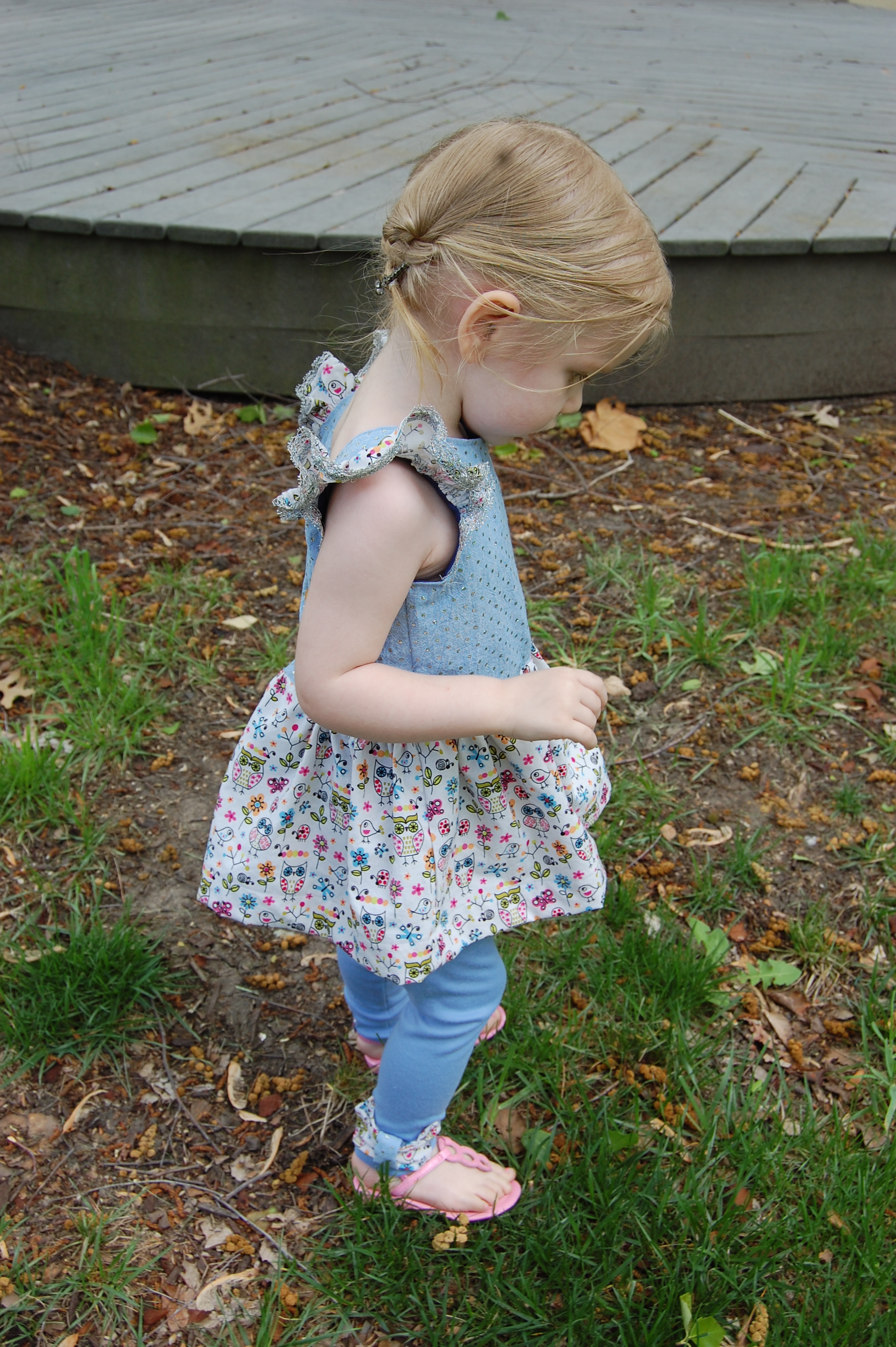 I’ve made the BSD Bow Tie Leggings (affiliate link) before, and as I’d expected, they sewed up quickly. Little Miss has quite the spring and summer wardrobe at the moment, as you may imagine, but if there’s anything she “needs” more of in her wardrobe, it’s leggings. I like to stretch dresses that fit her last year to this year by adding leggings under them so she can wear many of them like tunics. I used a similarly colored knit fabric from JoAnn’s and then made the bow from the owl cotton print and the smaller part of the bow from the silver dot chambray. I wish I’d had more of the lace, because I’d have added that as a trim on the bow. She was a big fan of the top and leggings set, and had she not dumped her milk and dinner all over the leggings, I’m sure she’d have worn them a few more days.